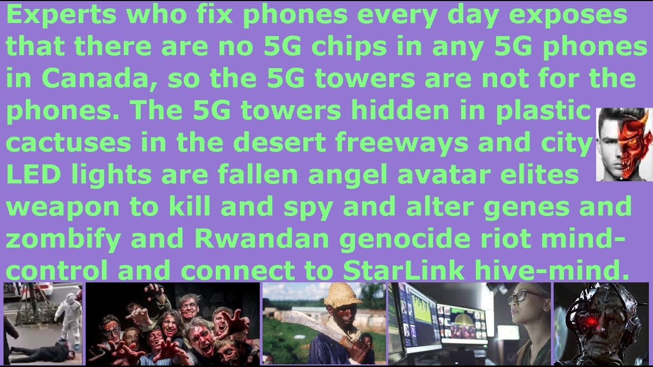 *** Intelligence news update from the Human Homo-Sapiens Race Survival Resistance (HRSR) headquarters and Republic Rebel Alliance battlefront (June 2023). Since they were cooking alive my head and neck and top of my shoulders yesterday while sitting in front of the computer, so that it felt like a sunburn and my palms & soles & armpits were dripping body liquid out, and they were cooking alive my heart & genital while sleeping last night, I will expose that their every 5G phones in Cananda do not have 5G chips inside, according to experts who fix phones every day, so the 5G tower “Rwandan genocide riots” “Wuhan China COVID biochemical weapon vaccine assassination genocide” “AI black goo nanite zombie fake virus” 5G technology is for the purpose of spying into humans’ toilets, and killing humans remotely, and controlling the brains & thoughts of humans, and connecting all COVID vaccinated humans to their 5G Starlink 42,000 satellites hive-mind fallen angel demon-possessed zombie human populace technology, and to alter the DNA of the humans into chimeras. End of transmission…
