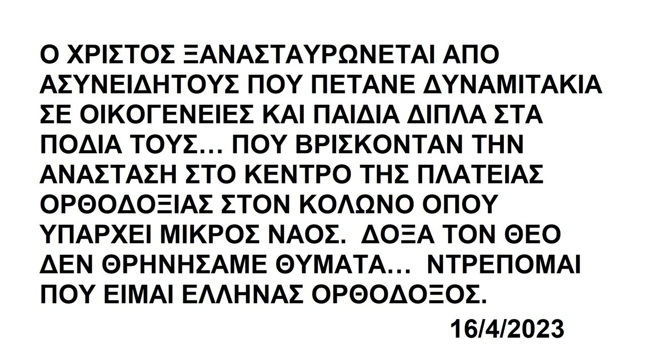 Ο ΧΡΙΣΤΟΣ ΞΑΝΑΣΤΑΥΡΩΝΕΤΑΙ ΑΠΟ ΑΣΥΝΕΙΔΗΤΟΥΣ ΠΟΥ ΠΕΤΑΝΕ ΔΥΝΑΜΙΤΑΚΙΑ ΣΕ ΟΙΚΟΓΕΝΕΙΕΣ ΚΑΙ ΠΑΙΔΙΑ ΔΙΠΛΑ ΣΤΑ ΠΟΔΙΑ ΤΟΥΣ… ΠΟΥ ΒΡΙΣΚΟΝΤΑΝ ΤΗΝ ΑΝΑΣΤΑΣΗ ΣΤΟ ΚΕΝΤΡΟ ΤΗΣ ΠΛΑΤΕΙΑΣ ΟΡΘΟΔΟΞΙΑΣ ΣΤΟΝ ΚΟΛΩΝΟ ΟΠΟΥ ΥΠΑΡΧΕΙ ΜΙΚΡΟΣ ΝΑΟΣ. ΔΟΞΑ ΤΟΝ ΘΕΟ ΔΕΝ ΘΡΗΝΗΣΑΜΕ ΘΥΜΑΤΑ… ΝΤΡΕΠΟΜΑΙ ΠΟΥ ΕΙΜΑΙ ΕΛΛΗΝΑΣ ΟΡΘΟΔΟΞΟΣ. 16/4/2023 https://ugetube.com/watch/hAg7zoyNOzrZkyA , https://rumble.com/v2igpb8--shame-of-antichrists-in-greece.html . (ΣΥΜΠΛΗΡΩΜΕΝΟ ΜΕ ΣΧΟΛΙΟ ΑΝΑΓΝΩΣΤΗ ΚΑΤΩΤΕΡΩ… ΚΑΙ Η ΑΠΑΝΤΗΣΗ ΜΟΥ).