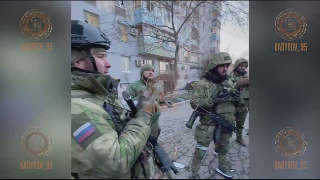 Chechens raise the flag over the administration building in Mariupol.