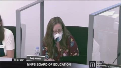 School board member who voted to mask children takes off her mask because she says it's difficult to read with it on.