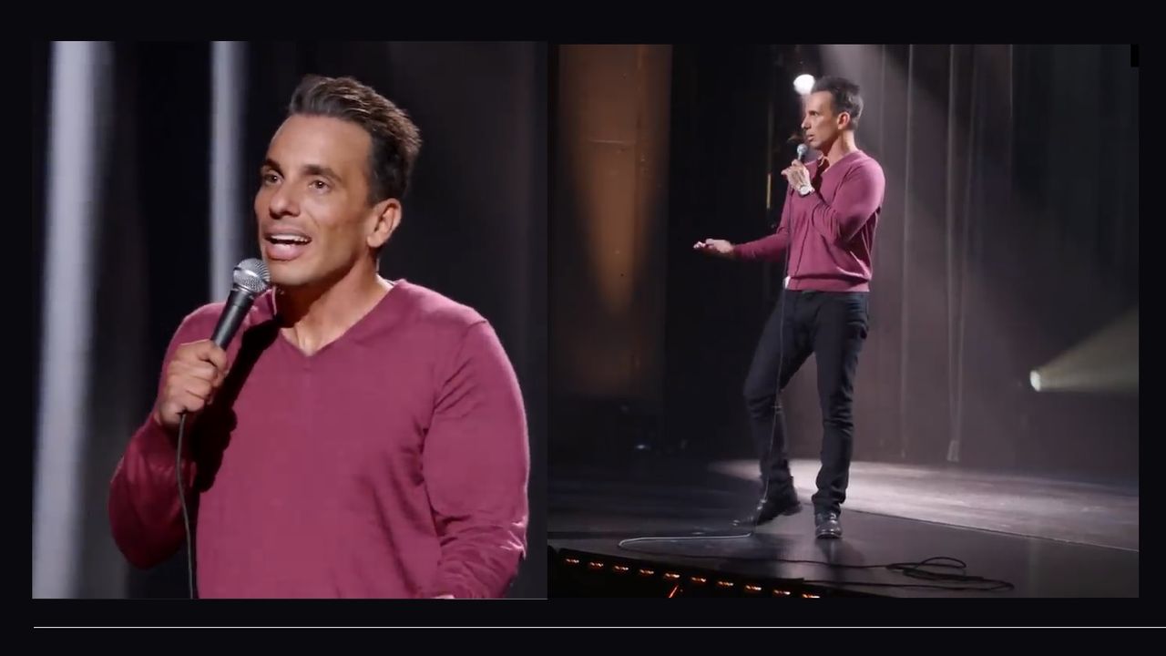 Comedian Sebastian Maniscalco reacts to neighbor in mask.