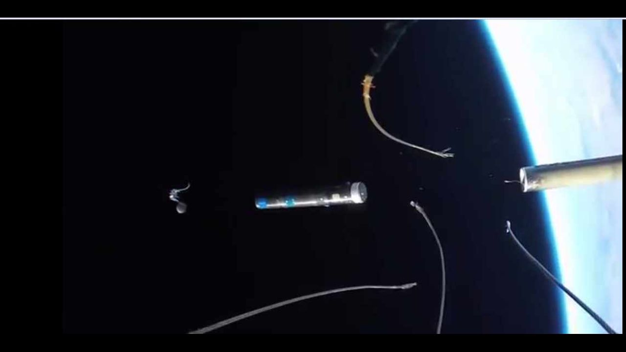 A vertically launched rocket suddenly stopping at 120 km (395,000 ft) altitude. The telemetry data showing temperature of -266C (-448F). The lens creating an alternating convex and concave effect due to its fish-eye property.