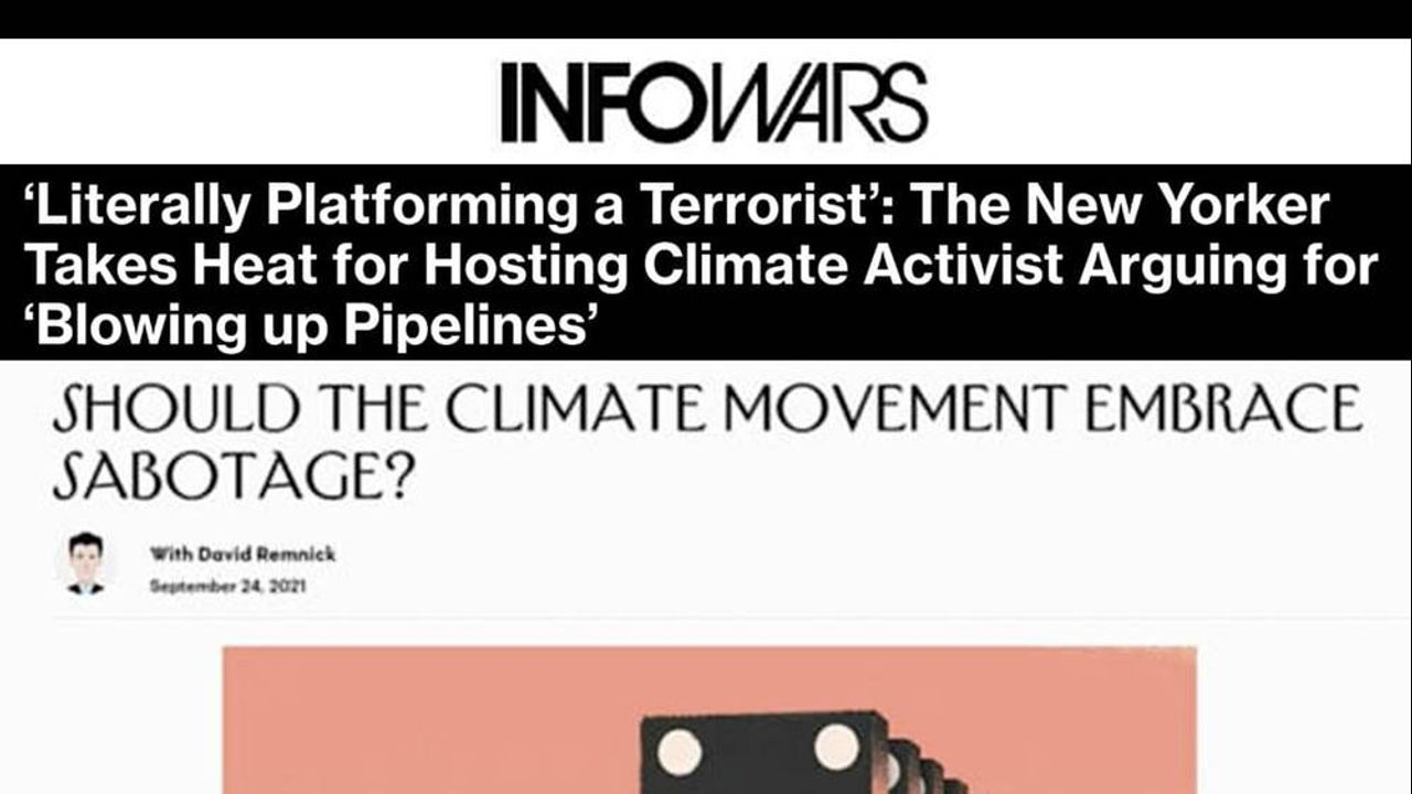 The New Yorker is accused of promoting violence after its podcast featured a climate change activist who called destruction of property the most effective protest tool, praising the violence that marred the George Floyd protests. Read more here: https://www.infowars.com/posts/literally-platforming-a-terrorist-the-new-yorker-takes-heat-for-hosting-climate-activist-arguing-for-blowing-up-pipelines/