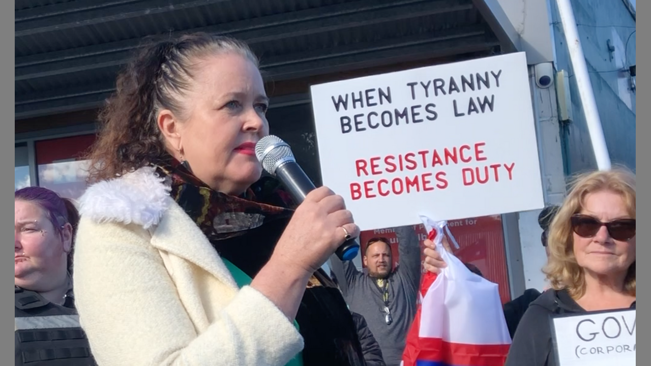 Tiamara Williams & Billy Te Kahika speaking in protest outside Jacinda Ardern's electorate Office, Auckland New Zealand