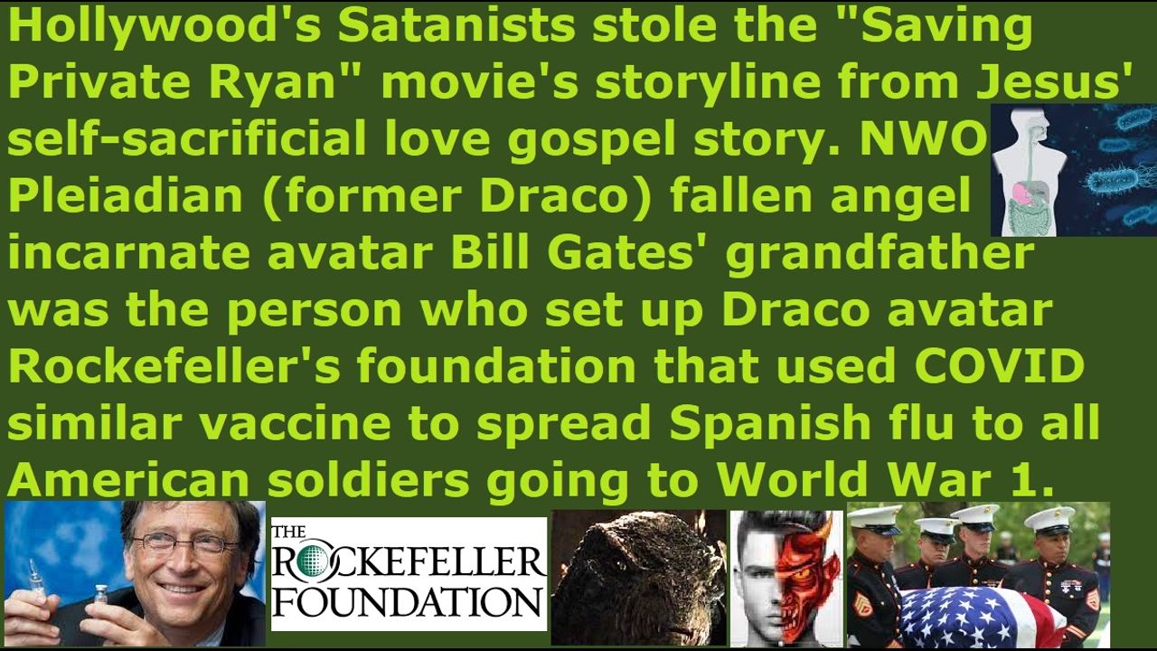 *** Intelligence news update from the Human Homo-Sapiens Race Survival Resistance (HRSR) headquarters and Republic Rebel Alliance battlefront (June 2023). Hollywood’s Satanists stole the “Saving Private Ryan” movie’s storyline from Jesus’ self-sacrificial love gospel story. NWO Pleiadian (former Draco reptilian chimera fake alien incarnate avatar) fallen angel incarnate avatar Bill Gates’ grandfather was the person who set up the Draco reptilian chimera fake alien incarnate avatar Rockefeller’s foundation that used the COVID similar vaccine to spread the Spanish flu to all the American soldiers going to World War 1, in order to depopulate as many humans made in the image of the Almighty Holy Righteous Loving Creator God YHWH Jesus. The Western feminist nations’ “women’s equality” “female church donators loving” “Jezebel spirit filled” “Satan Lucifer’s ordained & allowed & trained & non-assassination-attempts-receiving” fake unbiblical job position pastors and religious Christian hordes, who are redefining Bible verses and rebelling against women’s head coverings so that their heads are controlled by the fallen angels to stick their middle fingers up at God, and cross-dressing in “Satan Lucifer’s post-1960s cross-dress-project” men’s pants to mock God’s Word, and stealing from God and his real Christian apostles & elders 50% off the top of all their unbiblical post-1873 10% salary old laws illegal tithe income taxes for their own church staff’s and pastor’s illegal monthly salaries and for their own medical science witchcraft health insurance benefits to make God’s house into an extortionist gangster’s office, and doing hundreds of other things to remove all of God’s protection and replace Jesus with Jezebel & Sananda Jesus & Mammon & Adephagia and hundreds of other foreign fake gods, in order to bring judgment upon their Western feminist nations with sword & famine & plague & demon armies, are hiding all of this truth because of fear of assassination attempts and ridicule from church donators. Dear brethren, expose all their black nobility families and earth’s hidden matriarchal rulers elites’ names and identities and crimes and secrets and activities and plans and methods, because neither their NSA sulfuric acid & polonium radiation & mercury & flesh-eating bacteria HIV biochemical weapons, nor their FBI pinpoint heart attack EMF weapons, nor their CIA microwave oven weapons cooking alive from next door homes & rooms, nor their demon sent to attack you who rip apart their own Satanist Catholic exorcist priests in two, nor their witchcraft & psychic attacks, nor their income cut off starvation attacks, nor their CIA NSA MI6 FBI Freemason Jesuit Wicca Black Ops Satanist assassins who try to blow apart your head in your apartment lobby, nor anything else can ever harm you. Believe in God and his Word, and do not believe your pastors’ hundreds of redefined Bible verses that sow fear and unbelief and doubt and cowardice and hiding in fear and condoning evil in silence and traitor mentalities. Dear brethren, you are samurai warriors of Christ, so banzai charge the millions assassins and world rulers and their black nobility families nephilim & chimera & fallen angel incarnate avatar bosses and Draco Empire space fleets and fallen angels and Satan Lucifer and the earth’s hidden matriarchal rulers reptilian hybrid pedophile cannibal Satanist Pedogate Pizzagate “White House Pizza Night” LGBTPB (lesbian gay bisexual transvestite pedophile bestiality) orgy child sex magick ritual New Age Wicca witch feminists, who are torturing & lesbian raping (pegging) & satanic sacrificing & eating 12 million children and throwing their leftover human meat & bone ashes into the supermarket groceries & church food & fast food.