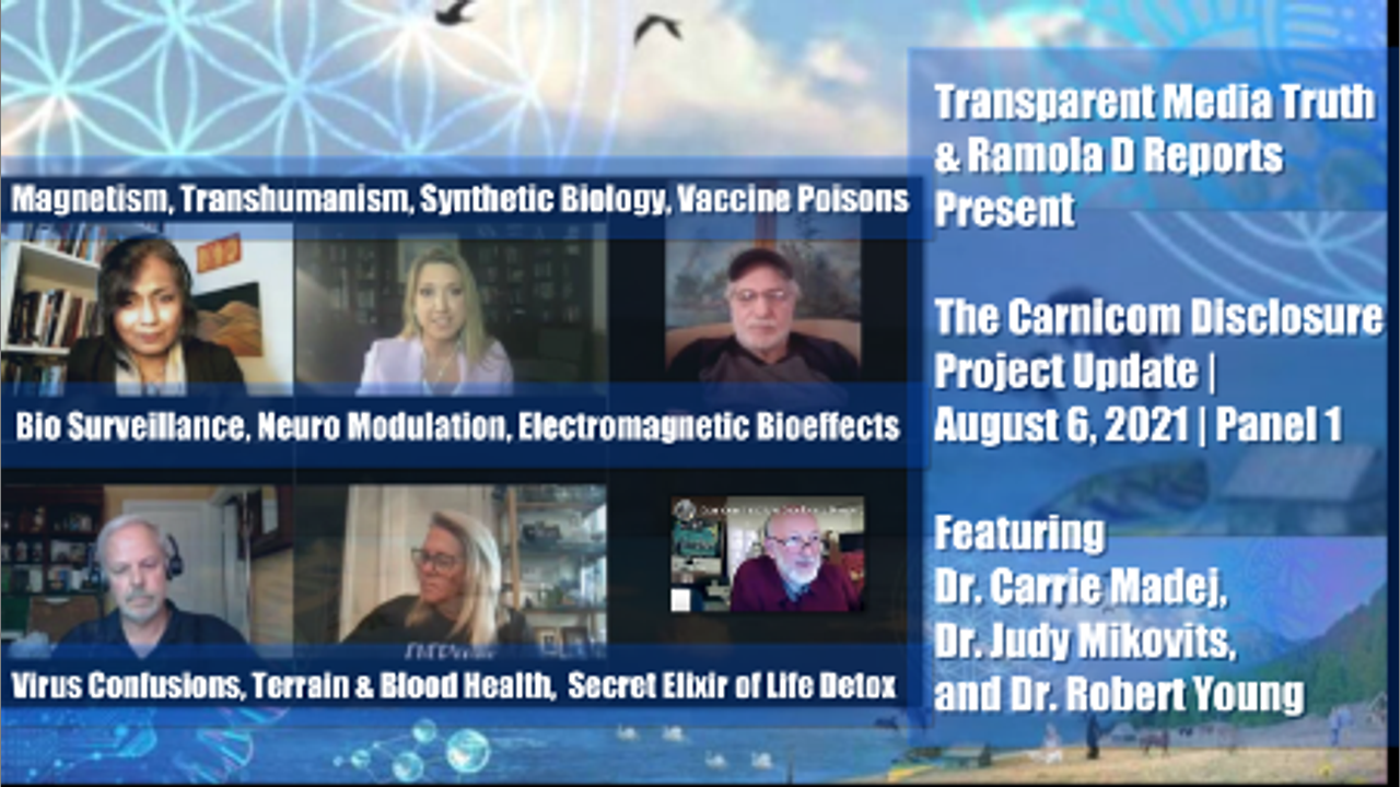 First in a planned series titled The Carnicom Disclosure Update 2021, Panel 1 features a powerful and wide-ranging conversation with physicians and molecular biologists Dr. Carrie Madej, Dr. Robert Young, and Dr. Judy Mikovits, grounded in the work of environmental scientist Clifford Carnicom to identify the nature of aerosol and in-body Morgellon's filaments across 20 years of research and inquiry, and addressing the related implications of today's findings of Nano Graphene Oxide in the COVID vaccines, flu vaccines, saline, chem trails; Magnetism among the vaccinated; Neuromodulation and biosurveillance; Poisons from fermented cell cultures, metals, viruses, fungi & other sources in all vaccines; CDC-acknowedged non-isolation of viruses, both SARS-COV-2 and all others; Germ Theory vs Terrain Theory; Great importance of Blood Health; EMF Bioeffects on Blood & Health; Secret elixir of life from the Essenes: green grass/plant juice; Need to Detox; and Great need to stand up for our children today and engage in Non-Compliance to all misled, scientifically-unfounded and tyrannical “guidance” or “mandates” from Pharma-run and deceiving governments pushing toxic poison, genome-modifying mRNA and nanotech-laden vaccines on us.