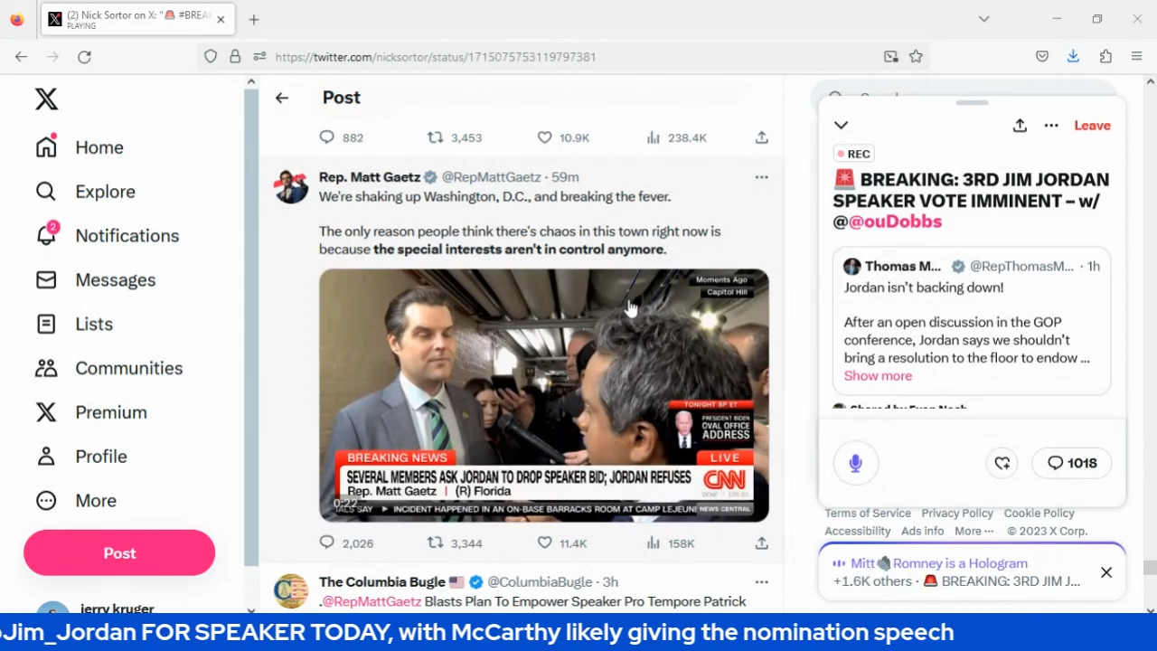 #BREAKING_ @MattGaetz EXPECTS A THIRD VOTE FOR @Jim_Jordan FOR SPEAKER TODAY, with McCarthy likel