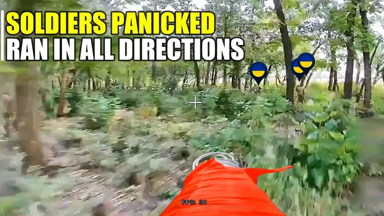 This is the situation on the real battlefield! Suddenly finding out they were being chased by Russian drone, a group of Ukrainian soldiers panicked 360 degrees, they ran in all directions looking for a hiding place to save their lives, but everything didn't go according to plan! The Russian channels released a short clip on September 12, 2025, a clear HD picture showing how a fiber optic FPV drone, operated by the Vanya Ivanov Group, was hunting for the presence of enemy forces in the forest belt west of Pokrovsk The Russian FPV entered through a line of trees during the pursuit, where some of the trunks had been marked with blue laces by Ukraine, marking as a trail mark for their comrades.