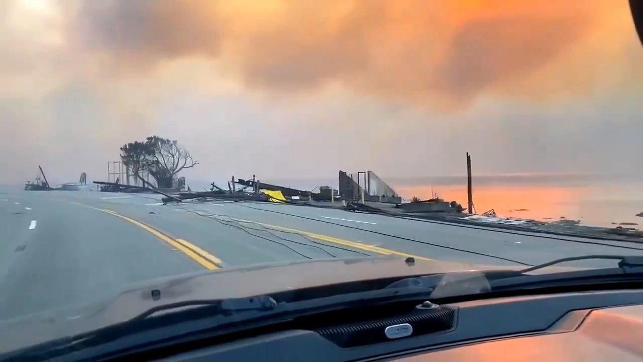 In the video, you can see how the houses on the Pacific Highway burned down, this is what is along the ocean, these were houses. Next, the video shows how the fire started in the Hollywood Hills (this is right in the center of Los Angeles). The video also shows a fire in a business district in Pacific Palisades. Further on in the video, two men and a dog can be seen stuck in a house surrounded by a fire in Palisade. The final part of the video shows ashes falling in downtown Los Angeles, near Hollywood.