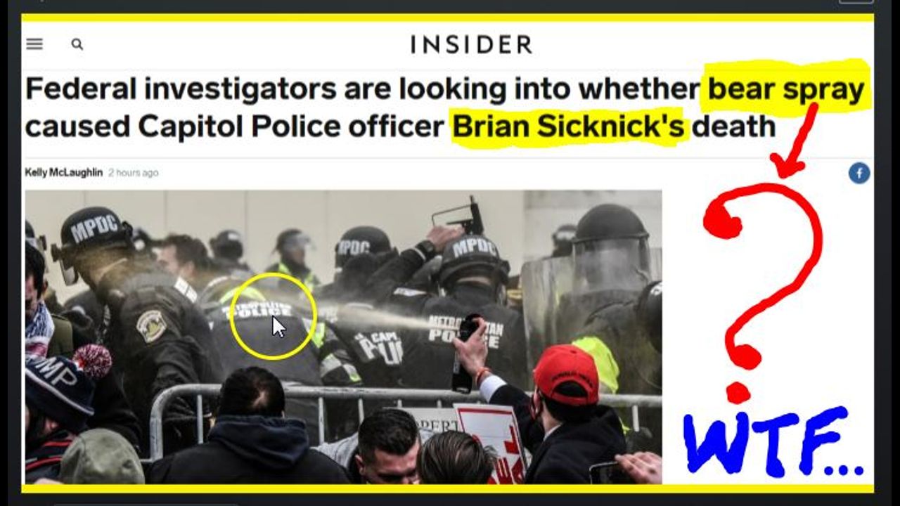 When the mainstream media reported that five people had died during the January 6th 'Insurrection' (that word makes me laugh) they mentioned that two people had heart attacks, one girl may have been crushed to death, another girl was shot by a Chuck Schumar body-double and we heard that a Capitol Hill cop was killed by the rioters when he was attacked with a fire extinguisher and beaten to death. The media (headed by CNN) told the world that the raging Trump protesters were relentless in attacking the poor 42 year old cop. That sounded over the top to me. Great thing that Revolver.com has been following up on this and with the help of war room Pandemic have questioned this and now the spin doctors at CNN are pulling the dead by fire extinguisher story and are telling the world that Sicknick died from being hit with 'Bear Spray' and apparently having a seizure. Sicknick's family is demanding answers and in the meantime Sicknick's body has been cremated and there was an autopsy done (no blunt force drama) and authorities have not given out the case of death. Leaving everyone - including CNN - to speculate at the cause of Sicknick's death. Just more psyops being played out by the Spin Doctors.