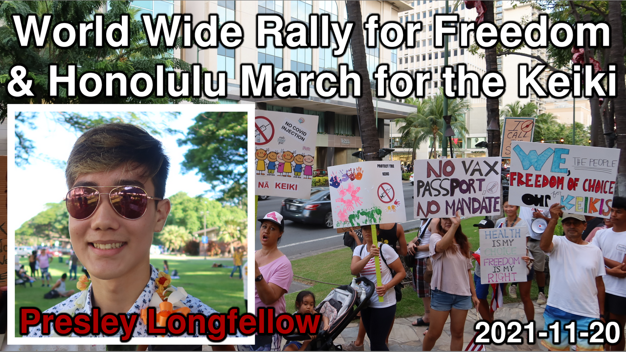On November 20, 2021, over 200 liberty loving people marched down Kalakaua Avenue in Waikiki to celebrate freedom and protest medical tyranny, vaccine mandates and segregation. This march is just one of many freedom rallies taking place all over the world on this day in more than 144 cities. Yet, did you hear about this on the mainstream news? A line up of inspirational speakers took to the microphone before the march. This is Presley Longfellow's speech. The speeches of each speaker and the march are all in separate videos.