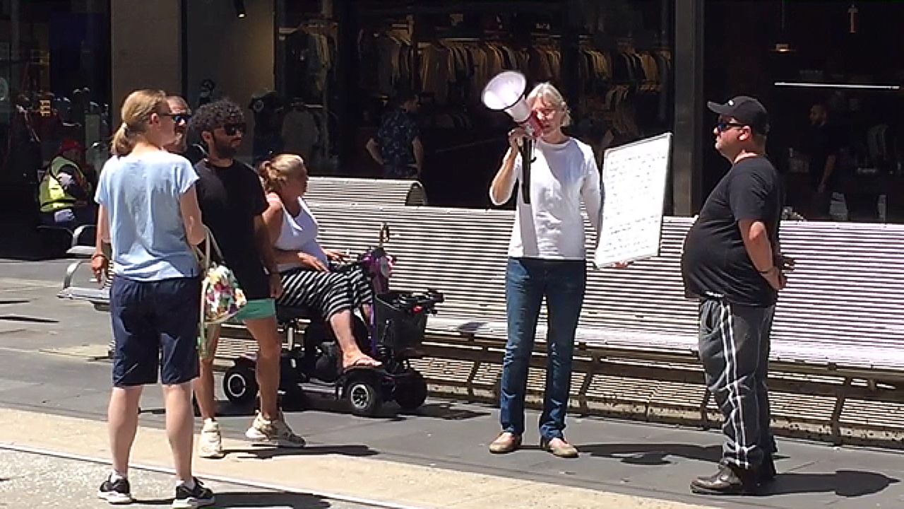 Part 1 of three videos of this Saturday's freedom rally, this one of the speeches in the Bourke Street Mall. Though our rally numbers are very small, we know that the people who used to march are still awake and appreciate that there is still a core of people making their voices heard. These speeches are important and will continue while there is life in us. We continually remind passes by of the great crime against humanity and many other related topics.