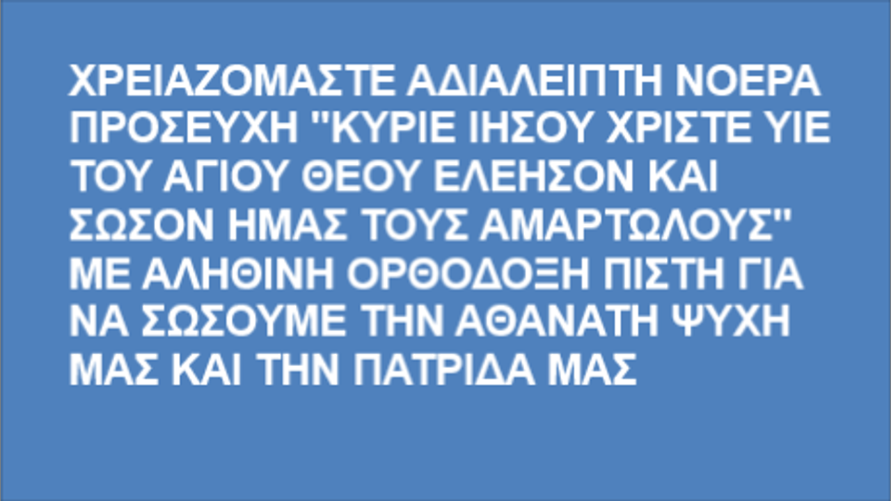 ΧΡΕΙΑΖΟΜΑΣΤΕ ΑΔΙΑΛΕΙΠΤΗ ΝΟΕΡΑ ΠΡΟΣΕΥΧΗ "ΚΥΡΙΕ ΙΗΣΟΥ ΧΡΙΣΤΕ ΥΙΕ ΤΟΥ ΑΓΙΟΥ ΘΕΟΥ ΕΛΕΗΣΟΝ ΚΑΙ ΣΩΣΟΝ ΗΜΑΣ ΤΟΥΣ ΑΜΑΡΤΩΛΟΥΣ" ΜΕ ΑΛΗΘΙΝΗ ΟΡΘΟΔΟΞΗ ΠΙΣΤΗ ΓΙΑ ΝΑ ΣΩΣΟΥΜΕ ΤΗΝ ΑΘΑΝΑΤΗ ΨΥΧΗ ΜΑΣ ΚΑΙ ΤΗΝ ΠΑΤΡΙΔΑ ΜΑΣ