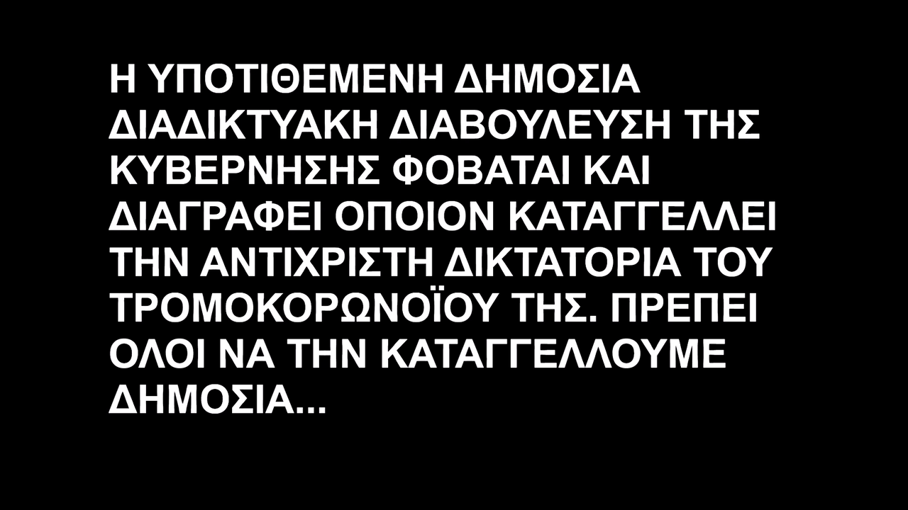 Η ΥΠΟΤΙΘΕΜΕΝΗ ΔΗΜΟΣΙΑ ΔΙΑΔΙΚΤΥΑΚΗ ΔΙΑΒΟΥΛΕΥΣΗ ΤΗΣ ΚΥΒΕΡΝΗΣΗΣ ΦΟΒΑΤΑΙ ΚΑΙ ΔΙΑΓΡΑΦΕΙ ΟΠΟΙΟΝ ΚΑΤΑΓΓΕΛΛΕΙ ΤΗΝ ΑΝΤΙΧΡΙΣΤΗ ΔΙΚΤΑΤΟΡΙΑ ΤΟΥ ΤΡΟΜΟΚΟΡΩΝΟΪΟΥ ΤΗΣ. ΠΡΕΠΕΙ ΟΛΟΙ ΝΑ ΤΗΝ ΚΑΤΑΓΓΕΛΛΟΥΜΕ ΔΗΜΟΣΙΑ