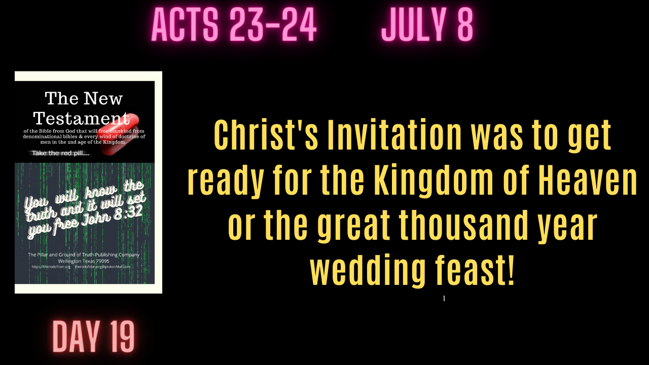 The Kingdom is like a wedding feast given by the Father for all of the righteous both living and dead- to celebrate the future marriage between the faithful and Christ for eternity! The celebration will last for 1,000 years broken up into two ages Eph. 2:7. These details of the feast have been hidden away by God for 1680 years – it is a part of the mysteries of the kingdom Matt. 13:11, or the hidden will of the Lord that is now revealed Eph. 1:9; 5:17. The Lord’s will is that for 6,000 years, after men were thrown out of the Garden of Eden Gen. 2:17, mankind would be under the subjective truth of men and that for 1,000 years salvation would be brought down from heaven in the Kingdom of God. Mankind has been in the spiritual dark ages/denominational apostasy 2 Thess. 2:3/a strong delusion 2 Thess. 2:11/under the subjective truth of men- the preaching of men. The Perfect Law of Liberty has been hidden away 1 Cor. 2:7 otherwise evil and ignorant men could never have stood up against God 1 Cor. 2:6-8. “Let God be true and every man a liar.” Rom. 3:4.