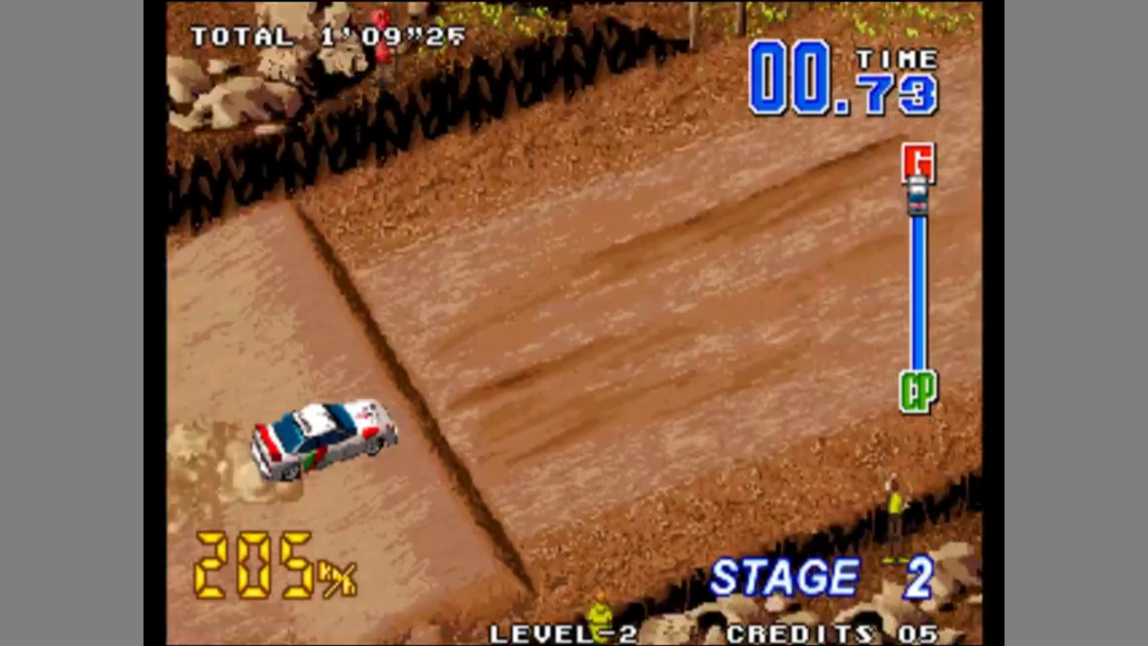 The game is an arcade racing game. You can either play alone or against a second player. In single player mode, you need to beat a series of courses in a fixed order. You need to reach the finishing line within a time limit. There are also CPU cars, but they act more like obstacles. The game is played from an isometric perspective. You can only steer left and right, accelerate or break. There are checkpoints in each course. If you reach a checpoint, you get additional time. There are three cars to choose from - the Mitsubishi Lancer, the Subaru Impreza, and the Toyota Celica. They differ in speed, control and body.