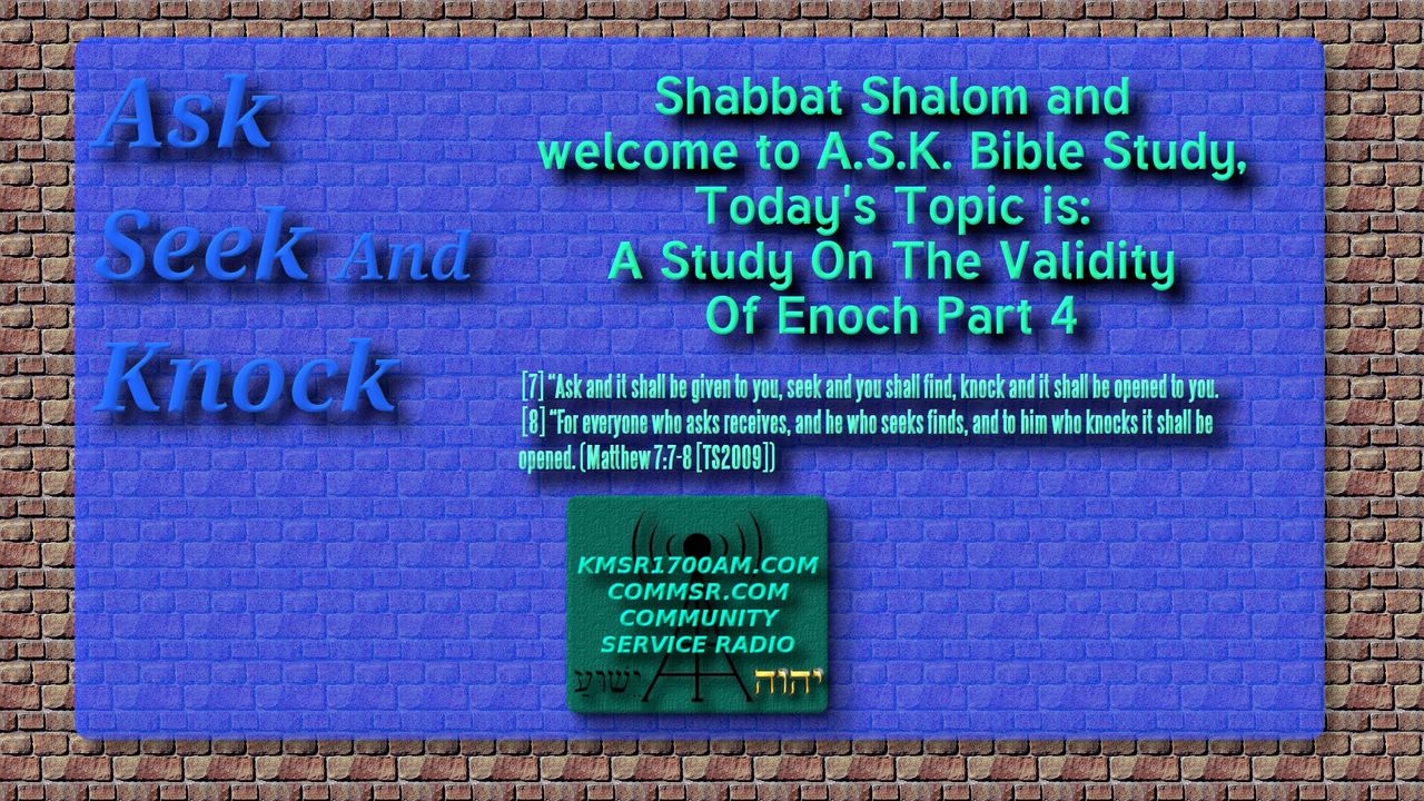 Thank you for Joining us with kmsr1700am.com for another addition of Ask Seek and Knock Shabbat Teachings. Today we discuss “A Study On The Validity Of The Enoch. Part 3?”. Grab your highlighters and your Scriptures and lets get to it.