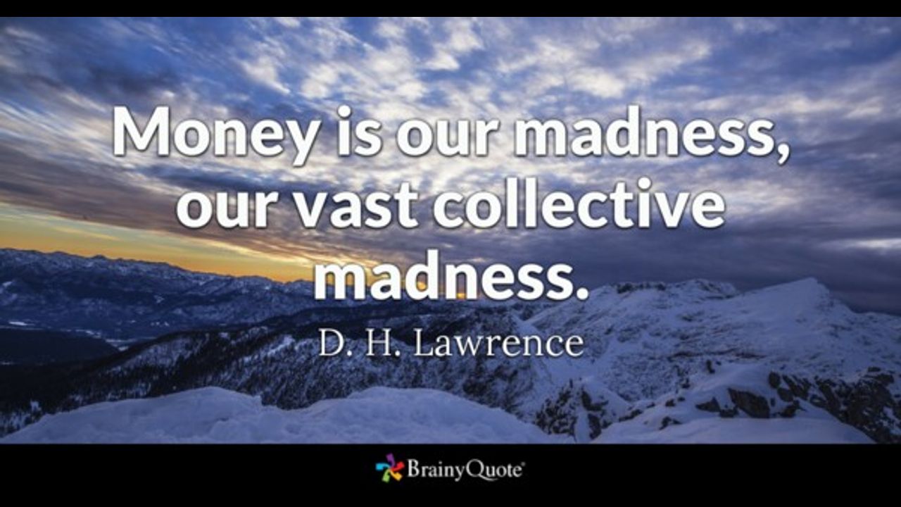 QUOTE ,, Money is our madness, our vast collective madness. D. H. Lawrence