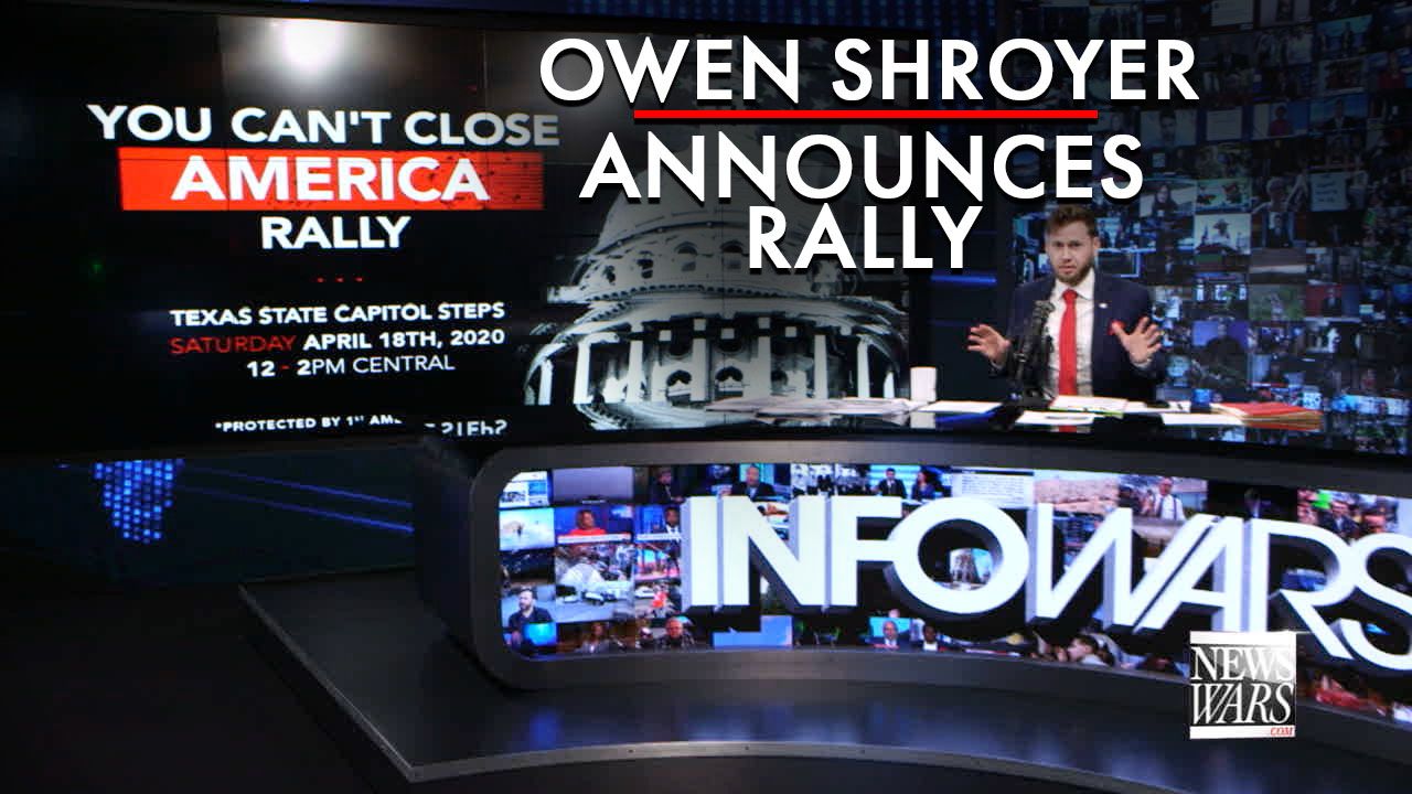 Owen Shroyer announces the 'You Can't Close America' rally on the steps of the Texas State Capitol in Austin this Saturday April 18th, 2020, at 12-2pm CST.