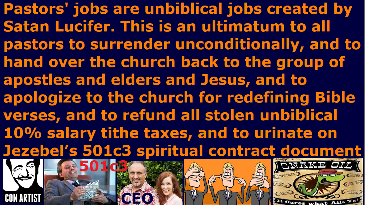 This is an ultimatum to all pastors and church clergy to surrender unconditionally, and to hand over the church back to the group of apostles and elders and Jesus, and apologize to the church for redefining Bible verses, and refund all stolen unbiblical 10% salary tithe taxes immediately, and to urinate on Satan’s 501c3 spiritual contract document.