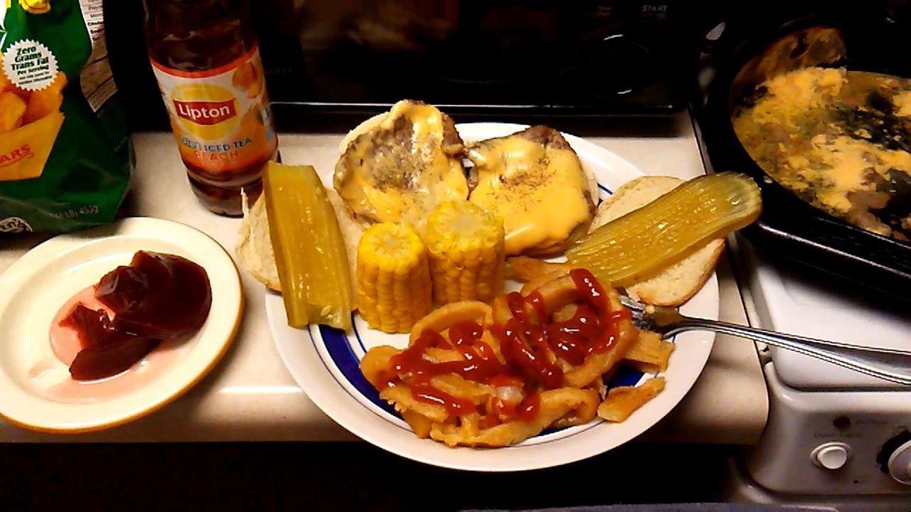 Cubed steaks on buns with Kraft American cheese, salt, McCormick pure ground black pepper, Mt. Olive bread and butter pickles, and Louisiana tartar sauce