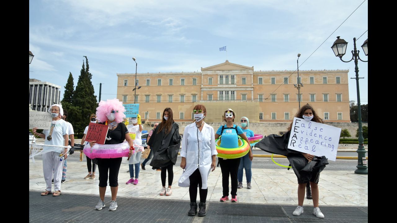 Διαμαρτυρία για τα μέτρα και τις μάσκες που διοργάνωσε το Αφυπνιστικό Θέατρο της Κίνησης ΦΩΣ ΣΕ ΔΡΑΣΗ , στο κέντρο της Αθήνας το Σάββατο 26/9/2020