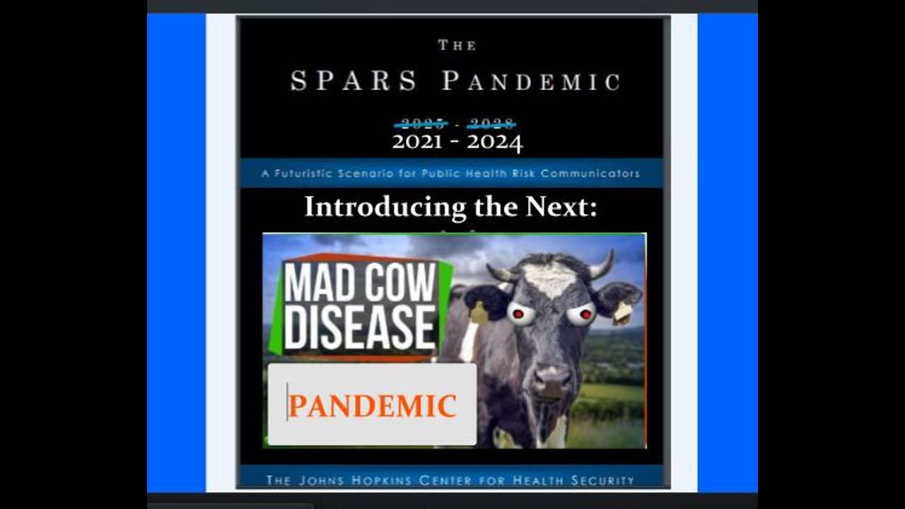 InfoWars has discovered the next wave of medical trouble that is coming our way as a result of the vaccines that they have issued during the Pandemic Hoax. As I have been saying in my recent videos the Vaccine is the Virus and now we are seeing their next health crisis as they (John Hopkins Center For Health Security) has published (in plain sight) the upcoming 'Mad Cow Disease' Pandemic. Alex Jones has two researchers breaking it down in a 90 minute video that I have used portions of. I live in Canada and we are already seeing cases of Mad Cow disease breaking out in Eastern Canada. Is this the beginning of Mad Cow breaking out which is really a delayed reaction to the vaccines that have been programmed to stay dormant for up to a year before they come back as a new unstoppable public disease?