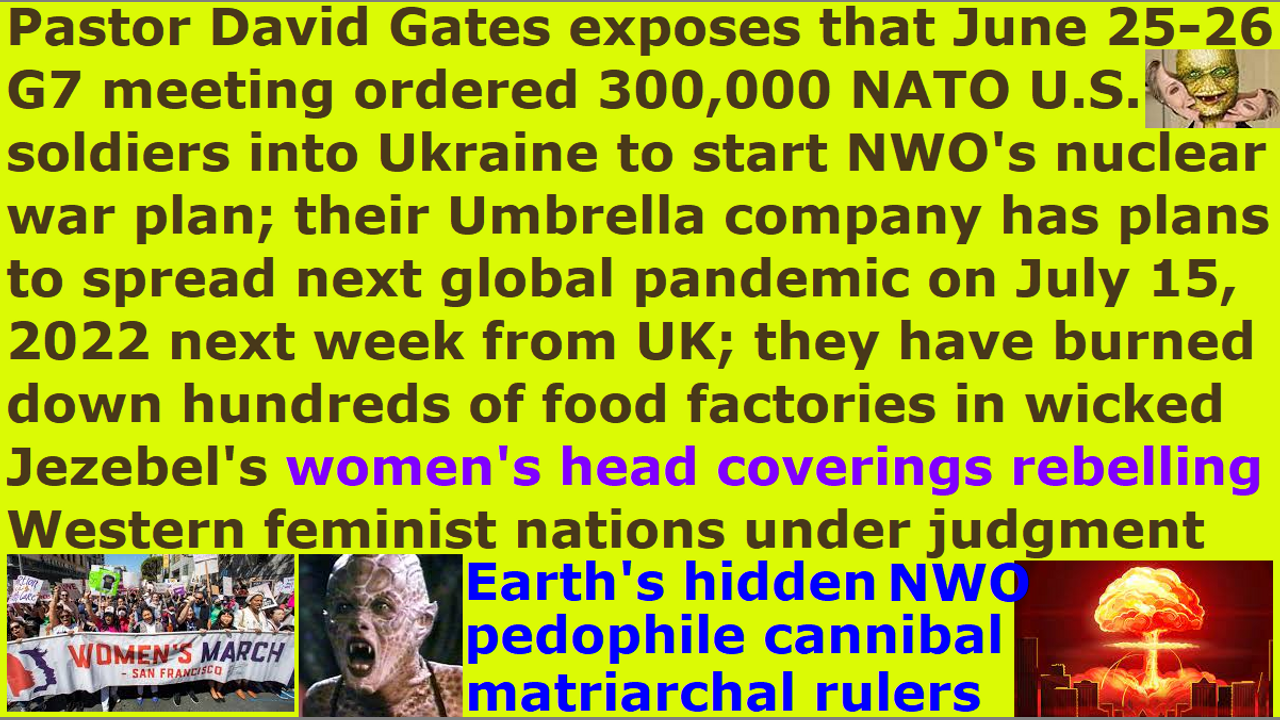 *** Intelligence news update from the Human Homo-Sapiens Race Survival Resistance (HRSR) headquarters and Republic Rebel Alliance battlefront (July 2022). Pastor David Gates exposes that the Illuminati NWO G7 meeting ordered NATO to move troops officially into Ukraine to fight Russian troops, and start Satan Lucifer and the Draco reptilian chimera alien Empire’s NWO World War 3 and nuclear war. They have moved 300,000 American troops into Ukraine and many more troops from other nations to genocide exterminate the human soldiers and millions of “useless eaters cockroach-level pest human specie and humanoid specie” civilians, and store their human meat as food in frozen storage for the Draco avatar elites. The COVID19 Coronavirus biochemical weapon AI “black goo” femtobot nanite 5G remote assassination neuralink satellite hive-mind t-Veronica zombie virus Borg vaccine’s Noah’s days Atlantis Umbrella company CEO Pleiadian fallen angel incarnate avatar cyborg lichten soldaten super soldier Tom Cruise (Richard Bay) and Chief Scientist fake human pedophile cannibal Satanist Bill Gates are planning to start their next pandemic on July 15, 2022 next week in Britain and spread it to the world. They have burned hundreds of food processing plants in the Jezebel-spirit-worshipper “women’s equality” End Times harlot Church’s Western feminist nations, and are planning a manufactured famine, and EMP strike to shut down all electricity to humans, and cut off of all diesel fuel to run transport trucks. Jezebel and her reptilian hybrid earth’s hidden matriarchal rulers are planning to castrate all their loyal Western feminist nations’ “Jezebel spirit filled” men, and make all their loyal Western feminist nations’ “Jezebel demon-possessed” women into lesbian child sex slaves. The reptilian hybrid elites often eat the women in their elites’ restaurants, because their meat is more tender than the human specie men’s flesh. Satan Lucifer (Sanat Kumara) and his Illuminati top hierarchy Shambhala ascended master fallen angel devils “Twilight Saga vampire” incarnate avatar elites may keep some human women to breed nephilim children with. The Western feminist nations’ “women’s head coverings rebelling fallen angel head controlled” religious Christian hordes and Satan Lucifer’s “ordained & allowed & trained” pastors are under judgment because they are rebelling against women’s head coverings so that their heads are controlled by fallen angels to stick their middle finger up at God, and cross-dressing in “Satan Lucifer’s post-1960s cross-dress-project” men’s trousers to mock God’s Word, and stealing unbiblical post-1873 10% salary tithe income taxes to make God’s house into an extortionist gangster office, and eating like Western female pastors who look like hippos from behind, and committing adultery every day with their second spouses they hunted in church, and conducting Semjaza’s medical science witchcraft every day by going to doctors, and worshipping Satan Lucifer with their church’s Christian worship satanic rock music band, and not burning their spiritual contracts with Satan Lucifer’s Illuminati 501c3 tax exemption certificates to get church donators, and refusing to remove their penis Osiris phallic symbol Washington Monument and vagina Isis symbol White House oval office and Isis symbol Statue of Liberty as we had told them for decades, and support their troops who are 70% infiltrated by Nazi 5th Reich imperial space fleet avatar & android & clone army who they refuse to expose, and worship their Satan Lucifer’s pre-1941 “The Plan’s” Bible prophecy rapture billion dollar industry’s pedophile cannibal Satanist reptilian hybrid pastors and hate us real Christians.