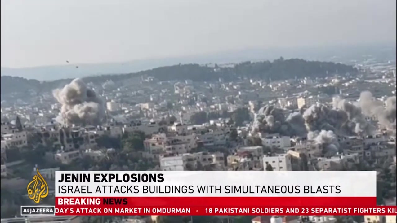Israel has carried out several simultaneous explosions in the Jenin refugee camp, destroying as many as 20 homes (20 buildings) in one residential neighbourhood. Dozens of Palestinians have been killed in Israel’s two-week military assault in the occupied West Bank.