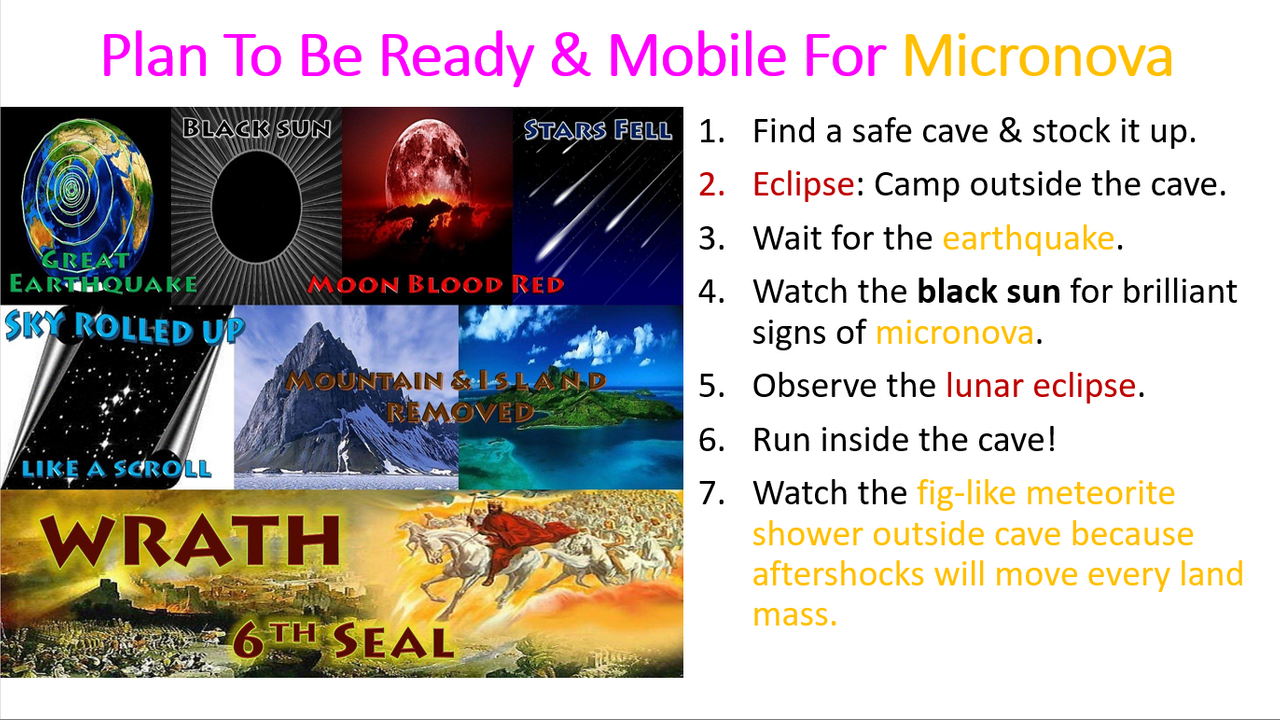 The Bible links a solar micronova with a blood moon eclipse in Rev. 6:12-17. That means we can't enter the final 7 years, called the tribulation, until after March 14, 2025. Why? When experts discovered that our star has an explosive miconova event every 12,000 years and that we're due, they started searching for other clues. They discovered the sun changes from yellow to white to red to black and then the micronova occurs. In the 6th Seal, the Bible tells us the timing of the black sun micronova will correspond with a blood moon eclipse, earthquakes, meteor showers and people running underground. You will need to be nimble to survive this time. This video will help you prepare for this prophesied disaster.