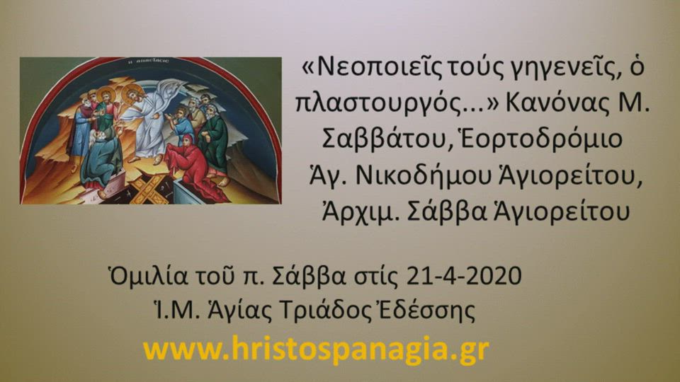 Νεοποιεῖς τούς γηγενεῖς, ὁ πλαστουργός...» Κανόνας Μ. Σαββάτου, Ἑορτοδρόμιο Ἁγ. Νικοδήμου Ἁγιορείτου, 21-4-2020, Ἀρχιμ. Σάββα Ἁγιορείτου