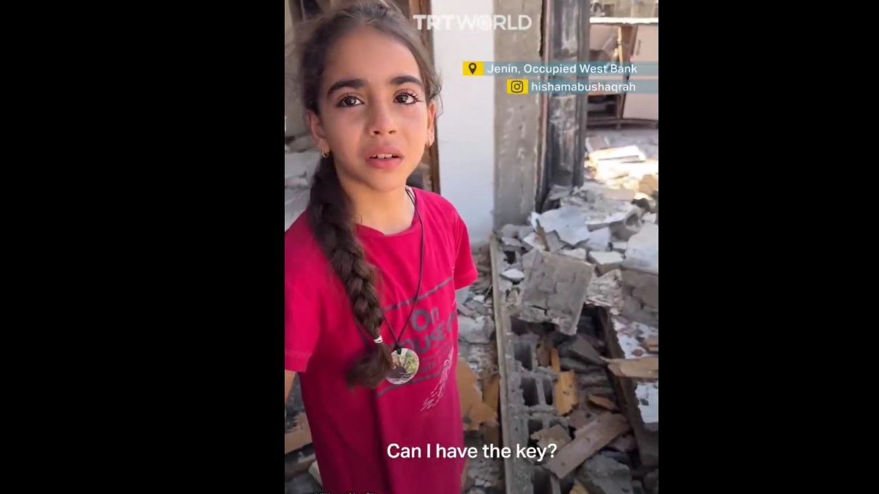 A young Palestinian girl asks for the key of her home to keep it as a memento, following its destruction by Israeli forces in Kafr Dan village, west of Jenin.