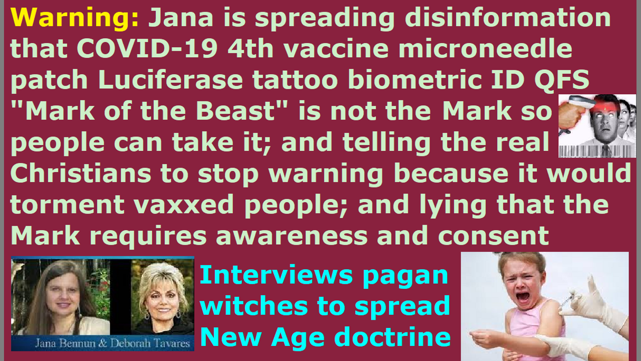 Jana BenNun is actually helping people to believe that since the microneedle patch Luciferase biometric ID tattoo 4th vaccine is not the “Mark of the Beast,” they can take it, because although Jana is saying not to take it because it is harmful, a lot of people are not getting sick because they received the placebo, so people will be impelled to take the vaccine when billions of people start dying from the first three injection COVID-19 vaccine prion contagion biochemical weapon. Jana herself admits that a lot of people, who she and her fellow New Age Wicca witch alchemy witchcraft homeopathy doctor friends told that the vaccine is not the “Mark of the Beast,” went ahead and took the vaccine because of that, although she told them it is harmful, because they were brainwashed by the mainstream media. This is the danger behind what Jana is doing to the people. She’s already probably killed a lot of those people, and not only killed but changed their human soul DNA into a soulless chimera and altered DNA entity. However, she is telling all the humans that all the people who are saying that the vaccine is the “Mark of the Beast” are evil, because they are tormenting all the heathens and religious Christians, who do not have the wisdom or discernment of God or God’s protection, by making them think that since they received the vaccine they cannot be saved or that their families who received it cannot be saved. Basically, when you listen to what she is saying, she is saying that you can be saved through Jesus, even if you receive the vaccine, because it is not part of the “Mark of the Beast” and it will not make you lose your soul DNA. At least not enough to make you lose your salvation in Christ. Jana will make many who took the first 3 vaccines because she told them that it is not the “Mark of the Beast” and are dying from the first 3 injection vaccines’ prion contagions, panic and rush to take the “Mark of the Beast” 4th microneedle patch vaccine, in order to prevent themselves from dying, and their blood will be on Jana’s hands. She is saying that the “Mark of the Beast” is not a real mark and it is going to be a spiritual mark of accepting her hated Zionist Israeli Talmudic religion. The 4th vaccine will be an actual physical mark using the 4th vaccine microneedle patch Luciferase biometric ID tattoo. Why is Jana hiding all these vital critical important truths that the 4th vaccine microneedle patch Luciferase biometric ID tattoo will be linked to the QFS (Quantum Financial System) digital currency Beast system and Elon Musk’s 42,000 satellite neurolink hive mind AI vaccine Beast system, when they are CIA agents? Jana and Steven BenNun also know that the first 3 injection vaccines are to spread the AI biochemical weapon prion contagion to cause massive deaths to cause panic so that everyone will rush to get the 4th vaccine microneedle patch biometric ID tattoo “Mark of the Beast” which will stop the first 3 injection vaccines’ prion contagion. Jana is saying that Satan Lucifer and the AntiChrist has to inform the humans that the “Mark of the Beast” is the “Mark of the Beast” and they need to get awareness and consent from the human who receives it, so the vaccine is not the “Mark of the Beast,” even when the Bible says the AntiChrist causes people to get it, so she is redefining the Bible verses.