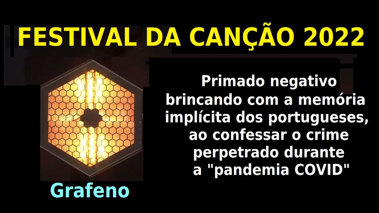 Mensagem subliminar insultando a memória implícita dos portugueses, enquanto confessa o maior crime já perpetrado no mundo. No Festival da Canção 2022, a forma de eleição dos holofotes mais visíveis foi o hexágono, a figura geométrica que representa a estrutura molecular do grafeno. Primado negativo confessa o crime em horário nobre anestesiando a percepção dos portugueses, em especial dos injectados com esse material tóxico por detrás da pandemia COVID, do fenómeno anómalo do magnetismo do corpo, arritmias cardíacas, lesões graves no sangue e circulação, perda de olfacto e/ou gosto, devido a níveis alarmantes de inflamação nos respectivos nervos cranianos, mas cujas lesões são generalizadas.
