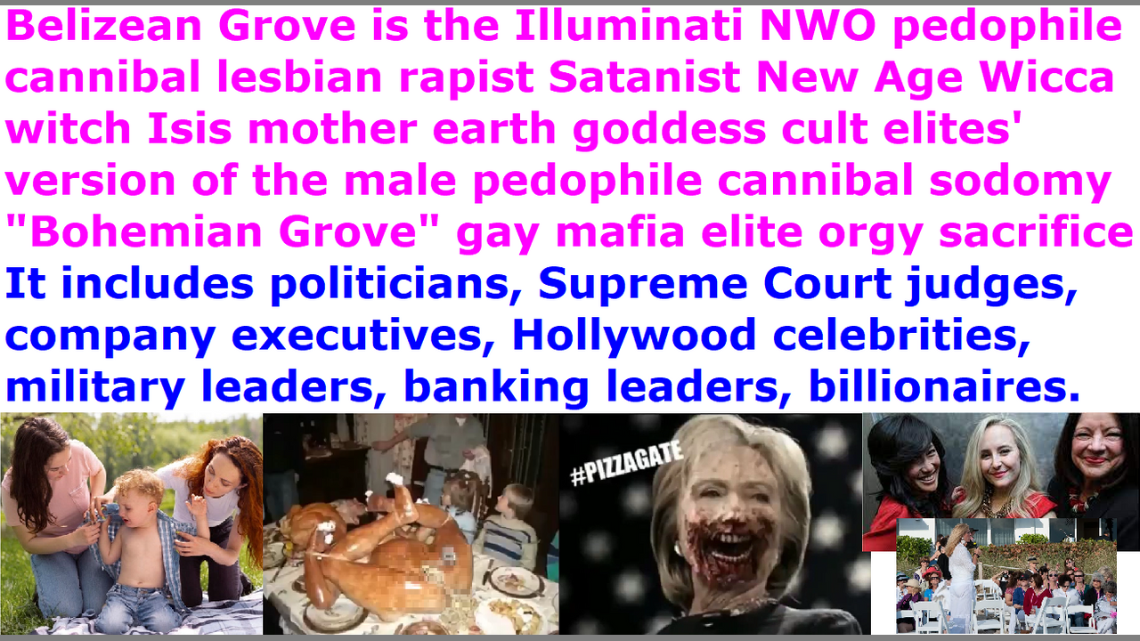 The “Belizean Grove” is one of the earth’s lower-ranking hidden matriarchal rulers pedophile cannibal mass lesbian rapist Satanist “Draco Pleiadian Mantis reptilian hybrid” Illuminati NWO New Age Wicca witch Noah’s days Atlantis priestess 5,000 year old mother earth goddess cult feminist women’s party counterpart to the men’s “Bohemian Grove” pedophile cannibal Satanist reptilian hybrid “gay mafia elite” LGBTPB (Lesbian Gay Bisexual Transvestite Pedophile Bestiality) orgy child sex magick “bisexual Draco chimera” “quadsexual Pleiadian nephilim” “multisexual Mantis chimera” “hermaphrodite Pleiadian fallen angel” spirit cooking ritual party. The only difference is that the “Belizean Grove” party tortures & lesbian rapes & sacrifices & eats human specie girls, compared to the “Bohemian Grove” party that tortures & lesbian rapes & sacrifices & eats human specie boys. They are the female politicians and Hollywood celebrities and supreme court judges and military leaders and congresswomen and royal families and church pastors and police leaders and CIA NSA MI6 FBI leaders and corporate executives and college professors and models and artists and Katy Perry singers that run the world and this hidden earth’s Isis goddess cult 5,000 year old Noah’s days Atlantis priestess pedophile cannibal reptilian hybrid nephilim civilization Satanist matriarchal system that has ruled society from the shadows. I would imagine that the higher ranking Draco reptilian chimera alien incarnate avatar globalist elite male spirits in cloned hybrid human avatar female bodies are not in the public, but they are in the black nobility families, and perhaps, they may be Hollywood actresses. Since they could not kill me yesterday, too, before their 24 hour suspension of my Facebook account expired, they now placed my Facebook account on a 28 day lower news feed, and thereby, basically making my Facebook daily sermons invisible to the dumb sinful End Times wicked human homo-sapiens specie populace. They do not want today’s video on the “Belizean Grove” seen by anyone, because after I posted about the “Bohemian Grove” probably a lot of their “Bohemian Grove” people got eliminated by rival Illuminati faction members who were so disgusted by their torture and eating of little boys, so they had to think up of a new way of censoring my today’s video. The witches are afraid that if the rival Illuminati faction members find out that there is a female “Belizean Grove” witches’ group, too, who are torturing and eating little girls, they would get eliminated, too. Since they could not kill me before the 24 hour Facebook account suspension expired, they had to find another way to censor my today’s video. So, they found past daily sermons, and made up several reasons to place my Facebook daily posts on the bottom of the news feed to make it almost invisible from the public so that no one will see today’s video and other videos I was planning to post in the coming days. They know what I am about to post, because they read our minds and they hack our computers. They placed me on 24 hour suspension by claiming that my sermon last year was “hate speech” against the pedophile cannibal Satanist matriarchal rulers mother goddess cult witch elites who are torturing & lesbian raping & sacrificing & eating 12 million abducted children every year, and they placed me on 28 day lower news feed by claiming that my sermon last year was “false medical information” that exposed their genocide extermination of billions of humans with their COVID-19 Coronavirus biochemical weapon vaccine. Hypocrites.