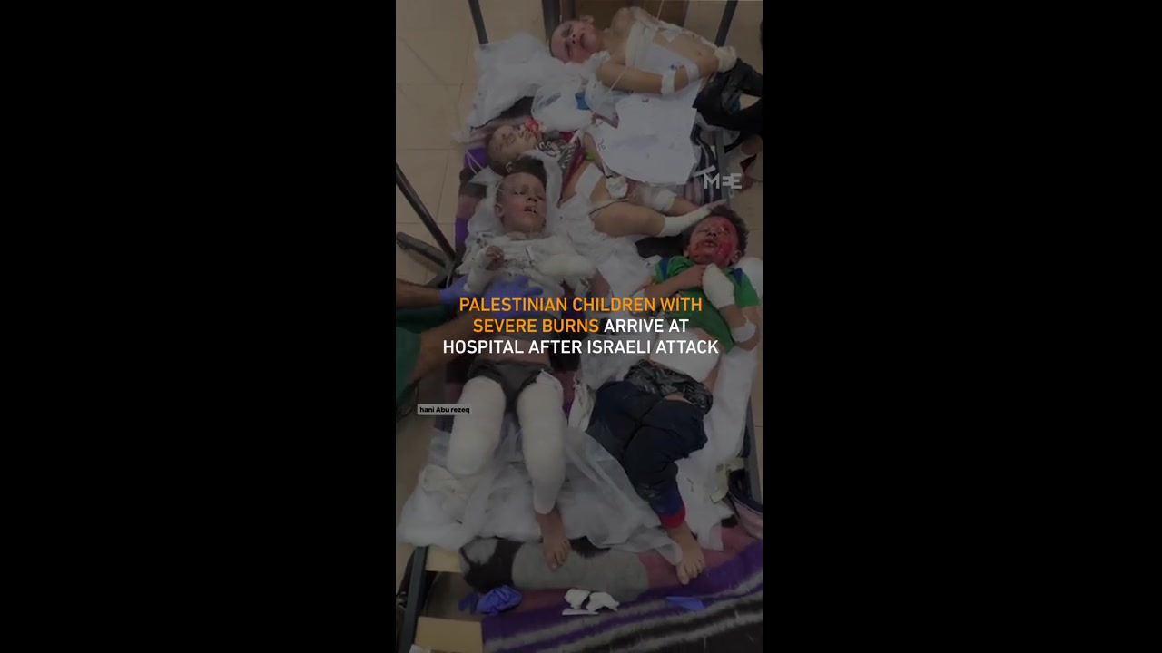 Injured Palestinian children with severe wounds and burns were taken to al-Aqsa Martyrs hospital following the Israeli bombing of their home.