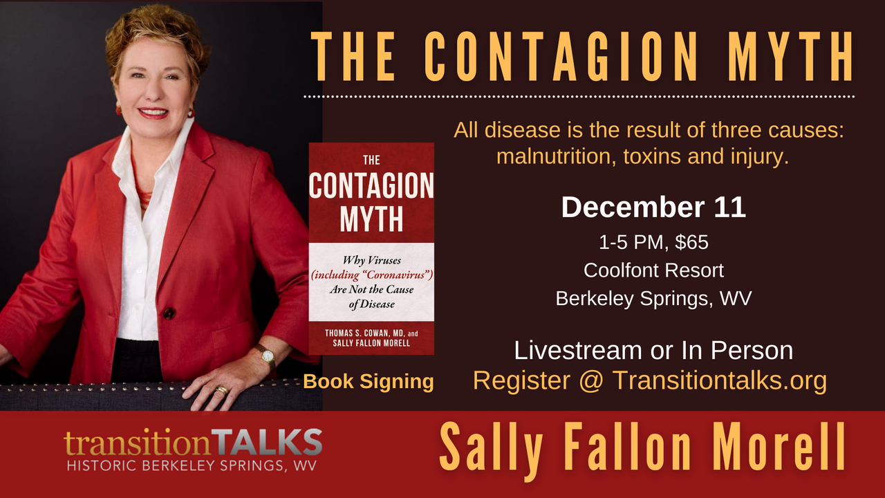 If you thought about this statement and said, “But they’re telling us that a “virus” is causing all of this “pandemic” . . . then you’ll really want to hear Sally Fallon Morrell, our next TransitionTalk speaker in December.