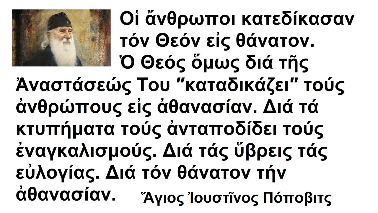 Οἱ ἄνθρωποι κατεδίκασαν τόν Θεόν εἰς θάνατον. Ὁ Θεός ὅμως διά τῆς Ἀναστάσεώς Του ″καταδικάζει″ τούς ἀνθρώπους εἰς ἀθανασίαν. Διά τά κτυπήματα τούς ἀνταποδίδει τούς ἐναγκαλισμούς. Διά τάς ὕβρεις τάς εὐλογίας. Διά τόν θάνατον τήν ἀθανασίαν. Ποτέ δέν ἔδειξαν οἱ ἄνθρωποι τόσον μῖσος πρός τόν Θεόν, ὅσον ὅταν Τόν ἐσταύρωσαν. Καί ποτέ δέν ἔδειξεν ὁ Θεός τόσην ἀγάπην πρός τούς ἀνθρώπους, ὅσην ὅταν ἀνέστη. Οἱ ἄνθρωποι ἤθελαν νά καταστήσουν τόν Θεόν θνητόν, ἀλλ᾽ ὁ Θεός διά τῆς Ἀναστάσεώς Του κατέστησε τούς ἀνθρώπους ἀθανάτους. Ἀνέστη ὁ σταυρωθείς Θεός καί ἀπέκτεινε τόν θάνατον. Ὁ θάνατος οὐκ ἔστι πλέον. Ἡ ἀθανασία κατέκλυσε τόν ἄνθρωπον καί ὅλους τούς κόσμους του.