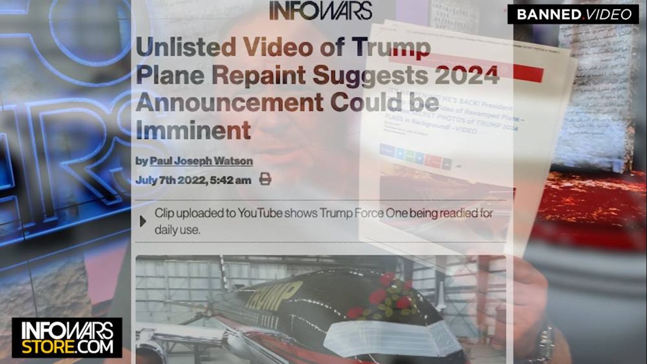 Unlisted Video of Trump Plane Repaint Suggests 2024 Announcement Could be Imminent: https://www.infowars.com/posts/unlisted-video-of-trump-plane-repaint-suggests-2024-announcement-could-be-imminent/