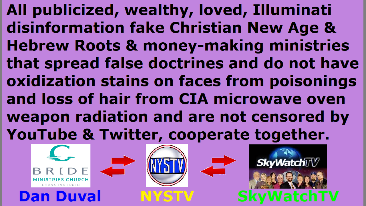 *** Intelligence news update from the Human Homo-Sapiens Race Survival Resistance (HRSR) headquarters and Republic Rebel Alliance battlefront (June 2021). The video is immovable evidence that all of the Illuminati disinformation famous loved popular wealthy Internet Christian ministries are related and interconnected and market each other’s occult esoteric witchcraft to their dumb religious Christian convert horde followers, who are redefining Bible verses and rebelling against “women’s head coverings” so that their heads are controlled by the fallen angels. The attached video shows that Pastor Daniel Duval, who is a New Ager who astral projects, is connected to NYSTV’s Jon Pounders and the fanatic feminist mason David Carrico, who are Hebrew Root movement Kabbalists though they make it look like they expose Kabbalah, and the Christian money-making business “soft disclosure” SkyWatchTV’s Josh Peck, who was a former New Ager that astral projected to talk to demon spirits just like Daniel Duval, and his SkyWatchTV host Derek Gilbert who is saying that it is safe to take the COVID-19 vaccine because it will not change your DNA genes. When you look at what they are all doing and saying from a criminal investigative deduction, they all link up like pieces of a puzzle that fit perfectly together with each other, and they all cooperate with each other to market each other, and they are all part of the same AntiChrist disinformation and false doctrine fake Christian media, who are trying frantically to cover up what we real Christians are exposing them by introducing their false information and false doctrines. They will use 90% truth that the real Christians share, and use 10% of their lies, which will destroy the religious Christian hordes who pay millions of dollars to them. A common underlying nature of these devil’s fake Christian ministries is that they all ask for donations, and they are all money-oriented, and they all sell books and sell God’s Word and sell God’s truth and anything else they can sell you, and they have amazing financial back up instead of being bankrupted and all their incomes cut off, and they are given publicity instead of being gang-stalked and receiving assassination attempts every day, and they receive support from the Illuminati Satanist pedophile cannibal witches’ cover up censorship groups like YouTube and Twitter who have removed all of the real Christians’ accounts and truth, and they do not have on their faces any oxidization stains from all the poisonings or warts from the fast-growing cancer frequency or loss of hair from all the CIA microwave oven weapon cooking alive from next door homes and rooms. They also do not restore the original Bible verses, but they pervert it, so they have huge numbers of followers of religious Christian convert hordes, and they do not all despise them. The person in the video talks about Carolyn Hamlett’s Illuminati handler and mind-controller witch Loren Grace as exposing witchcraft, but Loren Grace herself is a witch. After Carolyn Hamlett started realizing that Daniel Duval was a New Ager, Loren Grace immediately took over Carolyn Hamlett’s mind by making it look like she was exposing Daniel Duval and witchcraft, too. This is how these Satanist witches operate. Carolyn Hamlett is again under their control, and has stopped exposing their deep secrets, so their control is working. Repent and receive Jesus as Savior, and make straight the path of the Lord! End of transmission… ***