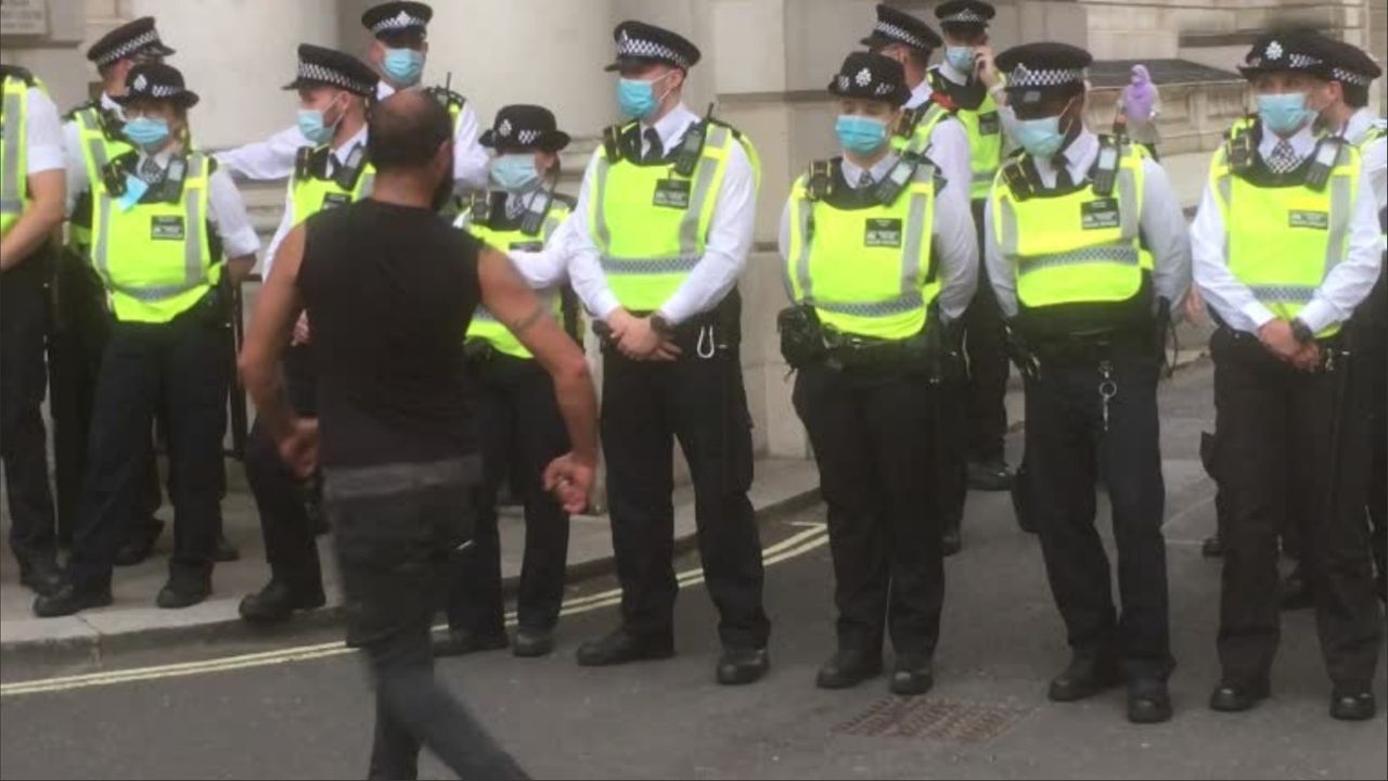 After Boris Johnson reneges on his promise to open up the country on June the 21st an angry crowd gathers outside Downing St. The Police try to arrest someone but the crowd gathers round and tries to stop it. The people have had enough of the Police enforcing the government Genocidal agenda. In the end they are mocked by the crowd.