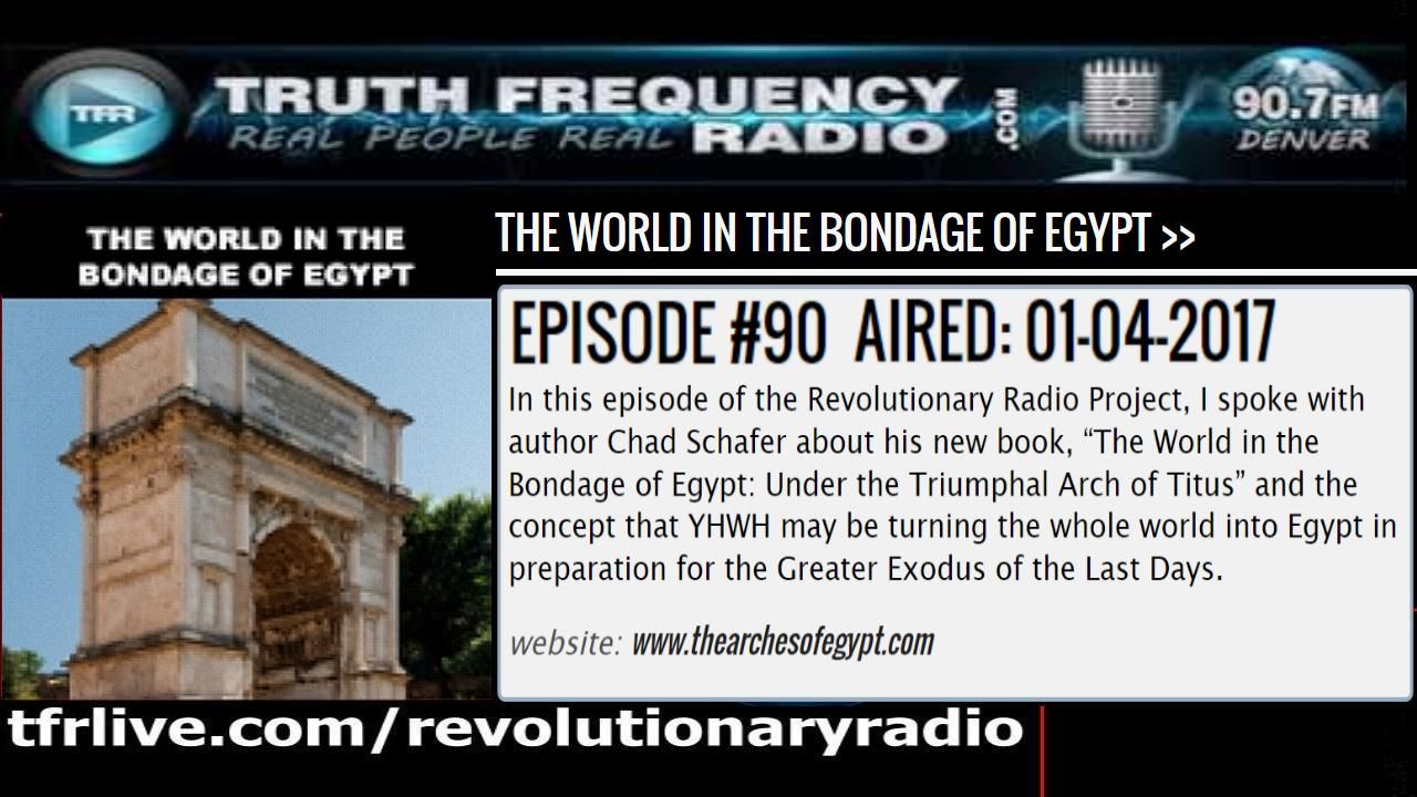 In this Jan 4, 2017 episode of the Revolutionary Radio Project, I spoke with author Chad Schafer about his new book, “The World in the Bondage of Egypt: Under the Triumphal Arch of Titus” and the concept that YHWH may be turning the whole world into Egypt in preparation for the Greater Exodus of the Last Days.