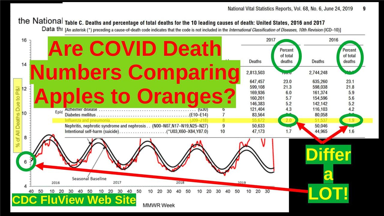 A forty-five minute video on the proper historical death numbers to compare the current total of claimed COVID-19 deaths with -- arguing that the 188,000 deaths from pneumonia and influenza on the CDC FluView web site is more appropriate than the smaller 55,000 deaths either from the CDC leading causes of death or the CDC influenza virus death model. ALTHOUGH the proper historical death number could be even larger if a significant number of deaths from heart attacks and other causes are reassigned to COVID.