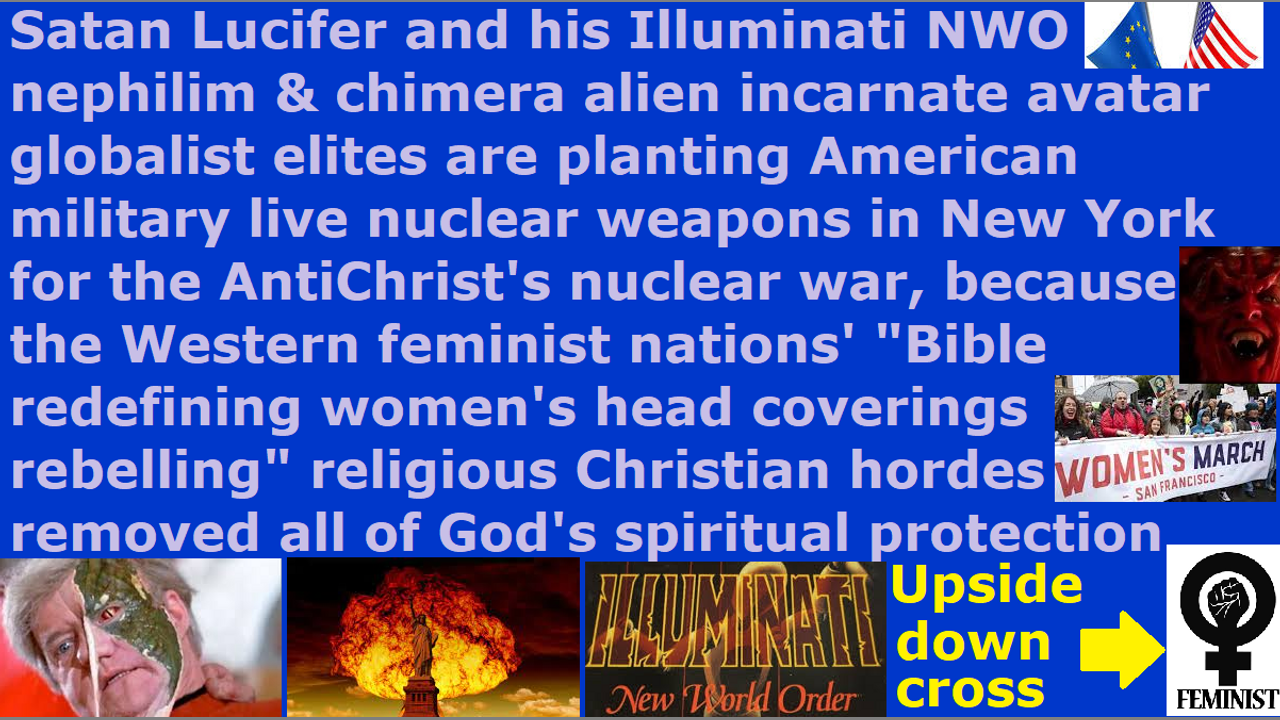 *** Intelligence news update from the Human Homo-Sapiens Race Survival Resistance (HRSR) headquarters and Republic Rebel Alliance battlefront (July 2022). Satan Lucifer’s Illuminati NWO one-world government nephilim & chimera alien incarnate avatar globalist elites are planting their CIA Al-Qaeda DHS ISIS terrorist agency’s American military live nuclear weapons inside New York city and other Western feminist nations’ cities in preparation for the AntiChrist's judgment by sword & famine & plague & demon armies upon the Western feminist nations’ religious Christian hordes and heathens, who are redefining Bible verses and rebelling against women’s head coverings to stick their middle finger up at God, and cross-dressing in “Satan Lucifer’s post-1960s cross-dress-project” men’s trousers to mock God’s Word, and stealing unbiblical post-1873 10% salary tithe income taxes to make God’s house into an extortionist gangster’s office. Warn the 6 billion humans, so that everyone will come to try to kill you frantically and slaughter your family, and all your church donators will leave you thinking you are a crazy lunatic heretic idiotic narcotic maniac. Preach this in your next Sunday church service sermon, so that 99% of your church donators will leave your church and God’s house will be cleansed of their religious filth. Do it now and do not wait until tomorrow, or have the blood of 6 billion people on your hands. All your families and the tens of thousands will fall down dead to your left and right, but you shall remain standing unharmed. Banzai charge the enemy, and glorify God, or be a cowardly traitor Western feminist nations’ “Bible verses redefining women’s head coverings rebelling fallen angel head controlled” religious Christian horde and pastor. When we real Christians expose things, the devil and NWO cancel their plans. We real Christian samurai warriors of Christ and the Holy Spirit in us are the light that exposes evil and the salt that prevents rotting, and we restrain the spirit of the AntiChrist. Do not believe Satan Lucifer’s “ordained & allowed & trained” pastors’ redefined Bible verses that you can get shot in the head by Freemason Jesuit Wicca Black Ops assassins, and your home gas pipes blown apart by CIA NSA MI6 FBI assassins, and your car remote-controlled off cliffs, but instead, believe God’s original Bible verses and kamikaze attack the enemy by exposing all their names and crimes and plans and secrets and activities and evils. If you remain silent, or if you insult God by trying to appease both Satan Lucifer and God by modifying & diluting & sterilizing & picking & choosing & editing the truth, then you are condoning the evils and you are coconspirators with Satan Lucifer. Glorify and exemplify God with honor, because Jesus gave his life for you on the cross so that you may receive forgiveness for sins and the gift of eternal life, dear brethren. Bullets and nuclear bombs and devils cannot harm you. We are invincible in Christ who loves us. All the fallen angel devils and people and groups who come to attack us will get destroyed as the Word of God says. Repent and receive Jesus as Savior, and make straight the way of the Lord! End of transmission…