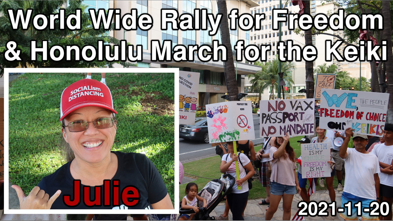 On November 20, 2021, over 200 liberty loving people marched down Kalakaua Avenue in Waikiki to celebrate freedom and protest medical tyranny, vaccine mandates and segregation. This march is just one of many freedom rallies taking place all over the world on this day in more than 144 cities. Yet, did you hear about this on the mainstream news? A line up of inspirational speakers took to the microphone before the march. This is Julie's speech. The speeches of each speaker and the march are all in separate videos.