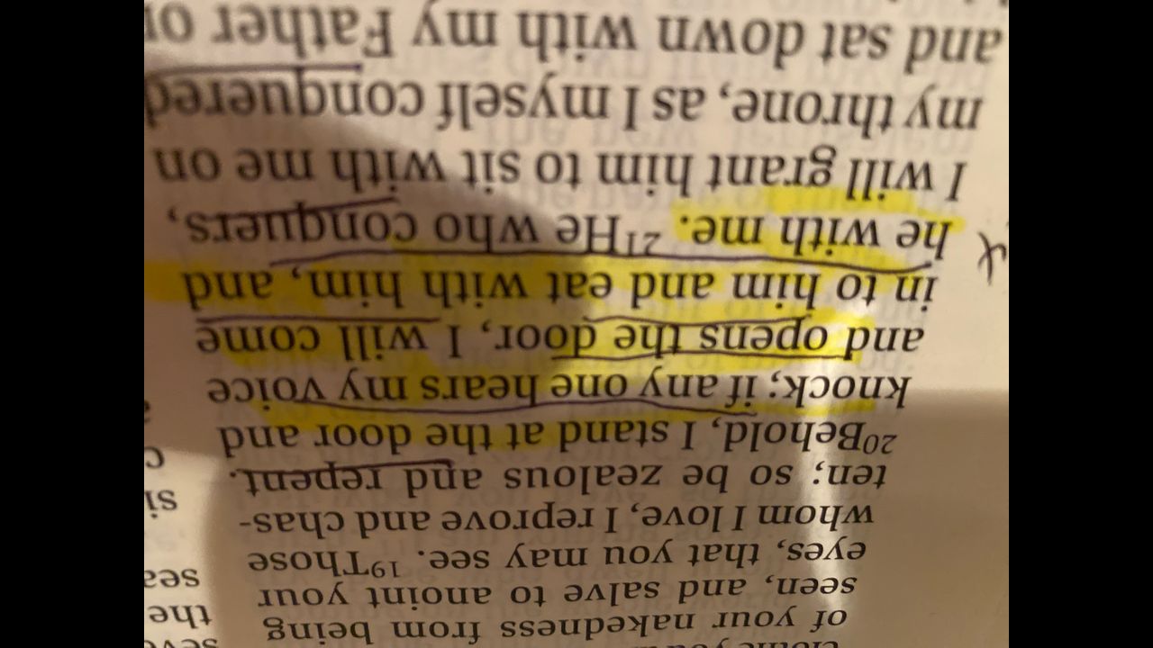 Jesus says, I know your works! Repent! Keep awake and have patient endurance! Open the door and I will come in and EAT with you!