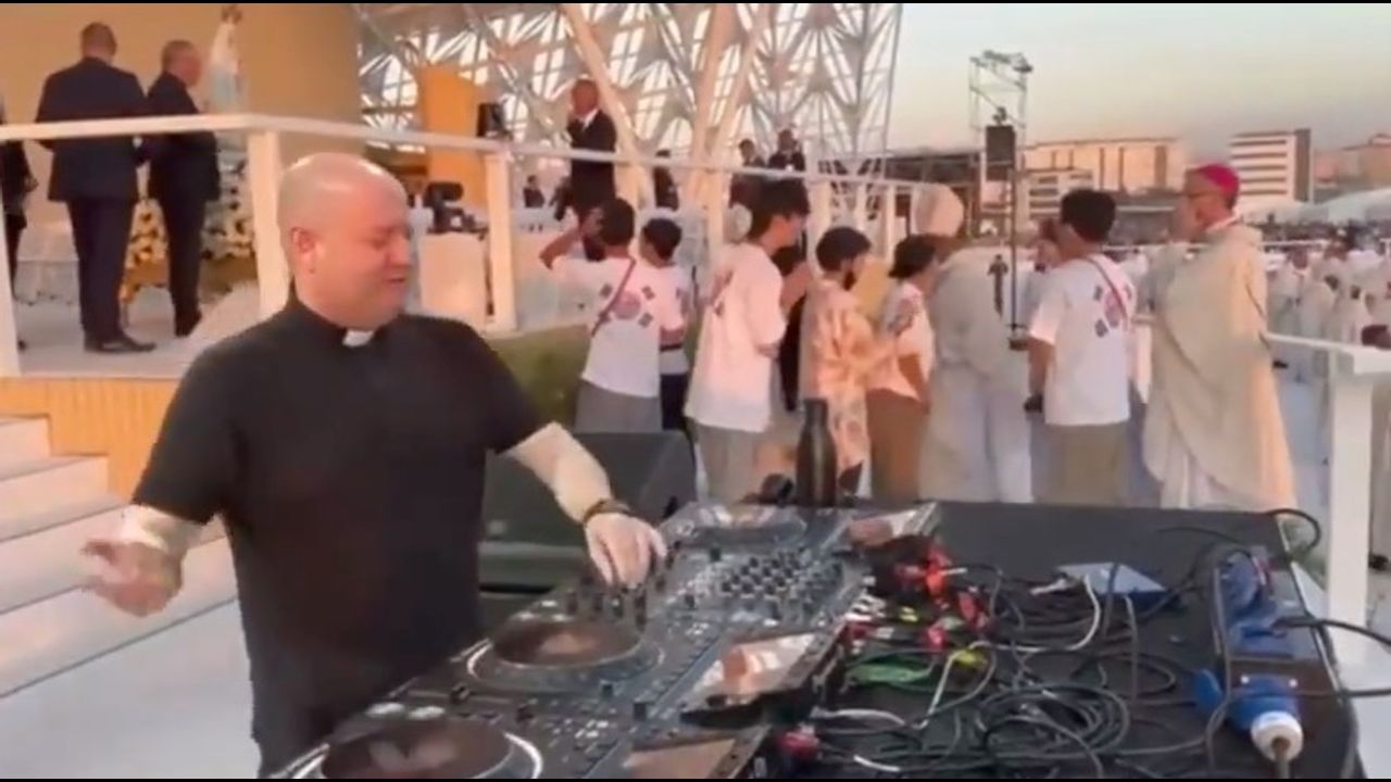 a disc jockey playing worldly music at a roman catholic event, which