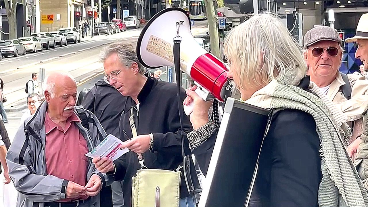 A shorter rally video with words expressing and exposing corruption at high levels at government and corporate level. This effort continues each Saturday to alert the passing shoppers in the Bourke Street Mall, Melbourne, to the evil agenda driving us toward enslavement.
