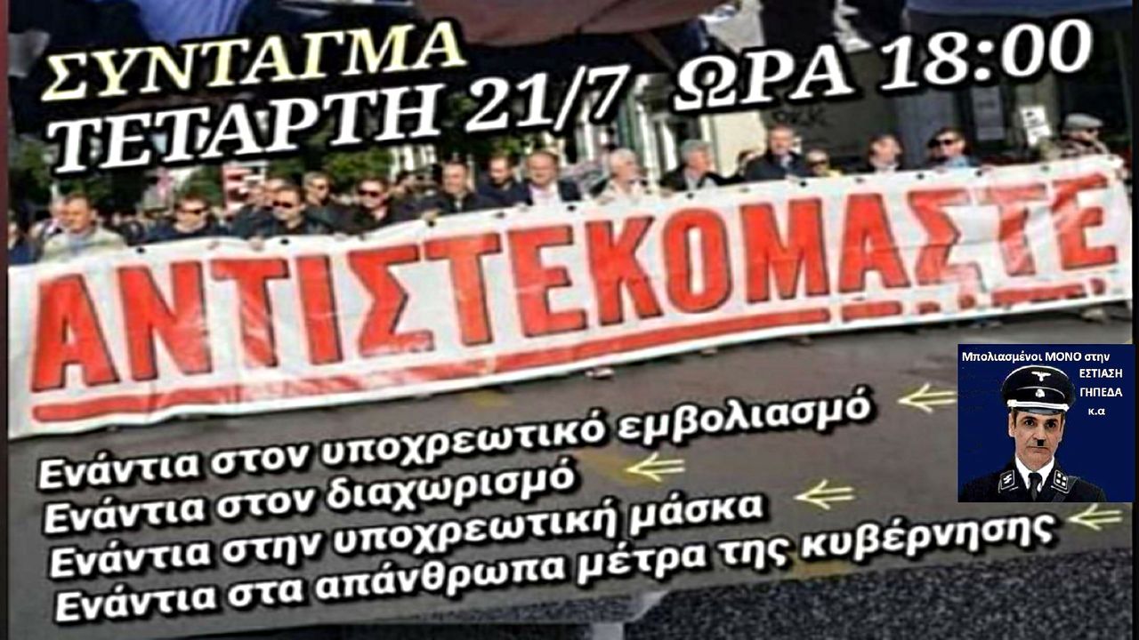 Τετάρτη 21/07/2021 ΝΕΑ ΣΥΓΚΕΝΤΡΩΣΗ ΣΤΟ ΣΥΝΤΑΓΜΑ ΚΑΙ ΣΕ ΑΛΛΕΣ ΠΟΛΕΙΣ ΤΗΣ ΕΛΛΑΔΑΣ ΕΝΑΝΤΙΑ ΣΤΟΝ ΑΝΟΜΟ ΥΠΟΧΡΕΩΤΙΚΟ ΕΜΒΟΛΙΑΣΜΟ, ΣΤΟ ΦΙΜΩΤΡΟ ΚΑΙ ΣΤΗΝ ΑΝΤΙΧΡΙΣΤΗ ΔΙΚΤΑΤΟΡΙΚΗ ΚΥΒΕΡΝΗΣΗ ΜΗΤΣΟΤΑΚΗ