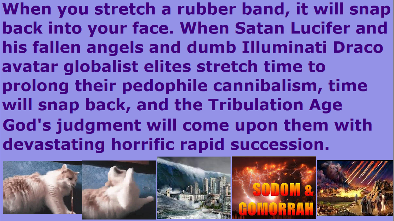 When these extremely dumb Illuminati NWO globalist elites stretch time, in order to try to get more time to pedophile rape and war pillage and cannibal eat children and vampire drink adrenochrome blood and torture children and create hybrid armies and hunt children in the forest, then from what I am hearing that will backfire on them horrifically, because time has a tendency to snap back like a rubber band. It means that they will not have their glory of an NWO revived Atlantis, but instead, it would be a 7-year Tribulation Age destruction and terror and judgment upon them that will come upon them all at once in rapid succession, and they will be totally destroyed and have no time to regain any standing. They will still end up with the same amount of time. Satan Lucifer and the grand mighty noble pervert molester ascended master fallen angel devils are like children, as ACIO’s Pete said. If you play with matches, you get burned, and if you play with rubber bands, it will snap you in the face. They need to stop tampering with God’s Creation, and desecrating it, and trying to destroy it and everyone in it, and annihilate time and space, and make all of God’s human homo-sapiens specie into a zombie apocalypse vaccine Borg, and fill this earth with kaiju monsters and xenomorphs and zombies and Halloween characters again, and drinking our children’s human DNA blood to take on human form to breed nephilim children with New Age Wicca witch “alien contactee” “ascended master contactee” necromancy demon spirit guide channeling “Twilight Saga” human witch servants. They will get spanked by God. End of transmission… They woke me up after four hours again, and every hour after that. My heart beat and breathing was accelerated, so they were doing something while I slept, just like the cowards that they are. They are a disgrace to the code of the samurai warrior. They came earlier today to pull the inside of my mouth between my teeth while I was eating to make me bite on it. However, it seems they were not molesting me while I slept. They were trying to stop my singing praise to God by trying to put me to deep sleep though. How would they like it if God put them into a coma when they try to molest his children instead? Would they like that? They do not think in terms of the other person’s welfare, but they only think about how to conduct perversion on other people’s children. That is why they are pedophile demon spirits. This evil will not stop until these evil spirits are removed and this earth is cleansed of them. Let the children molest these demons while they sleep instead. End of transmission…The best way for Satan Lucifer and the Illuminati pedophile cannibal Draco reptilian chimera alien incarnate avatar Satanist globalist elites to destroy God’s Church and hide all the truth from the Christians is to create a fake unbiblical positions called a pastors, and kick out all of God’s real Christian apostles and elders, and place their most cowardly traitor mind-controllable Jezebel-spirit-controlled Atlantis-Babylon-Western-values Satanist-theology-seminary-certified Satan-ordained church pastors in a church company, and have them mislead all the religious Christian freak hordes into redefining hundreds of Bible verses, and rebel against women’s head coverings, and tax unbiblical 10% salary tithe taxes from them, and flood the churches with millions and millions of useless meaningless worthless religious Christian freak hordes, and kick out all the real Christians immediately when they come in. Hence, we have the most apostate ungodly harlot Church in the End Times as Jesus prophesied would happen. Beware, dear brethren, lest you get destroyed with them. They will betray you. You have been warned.